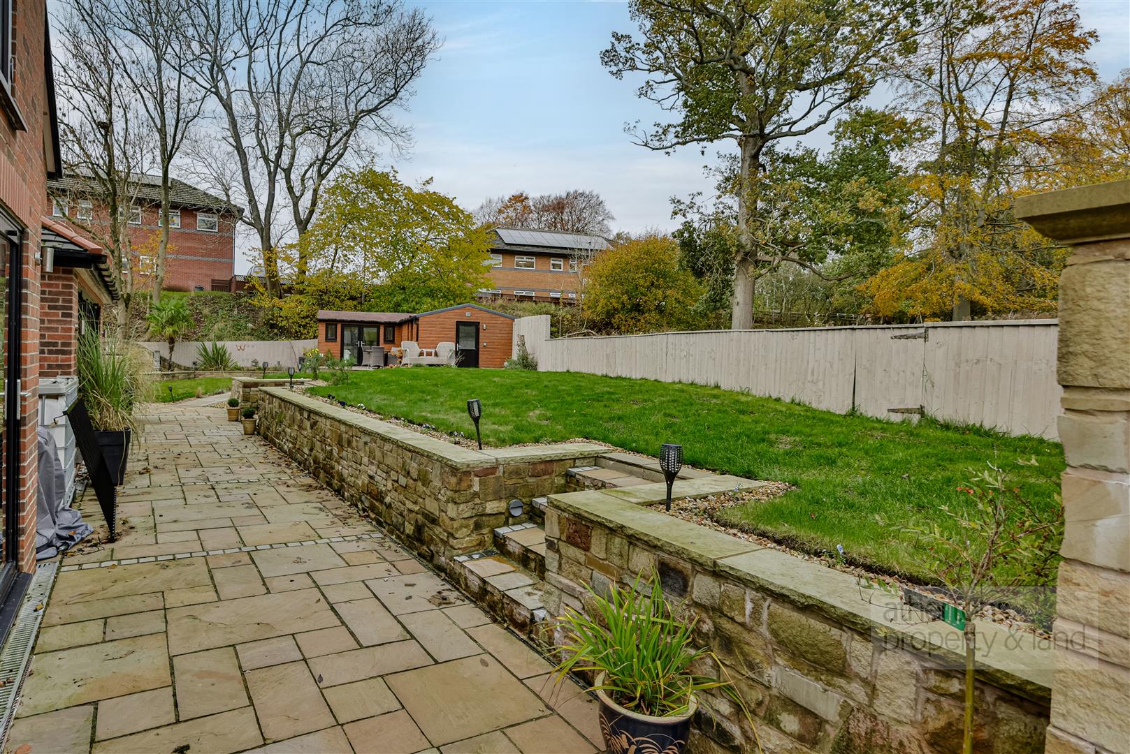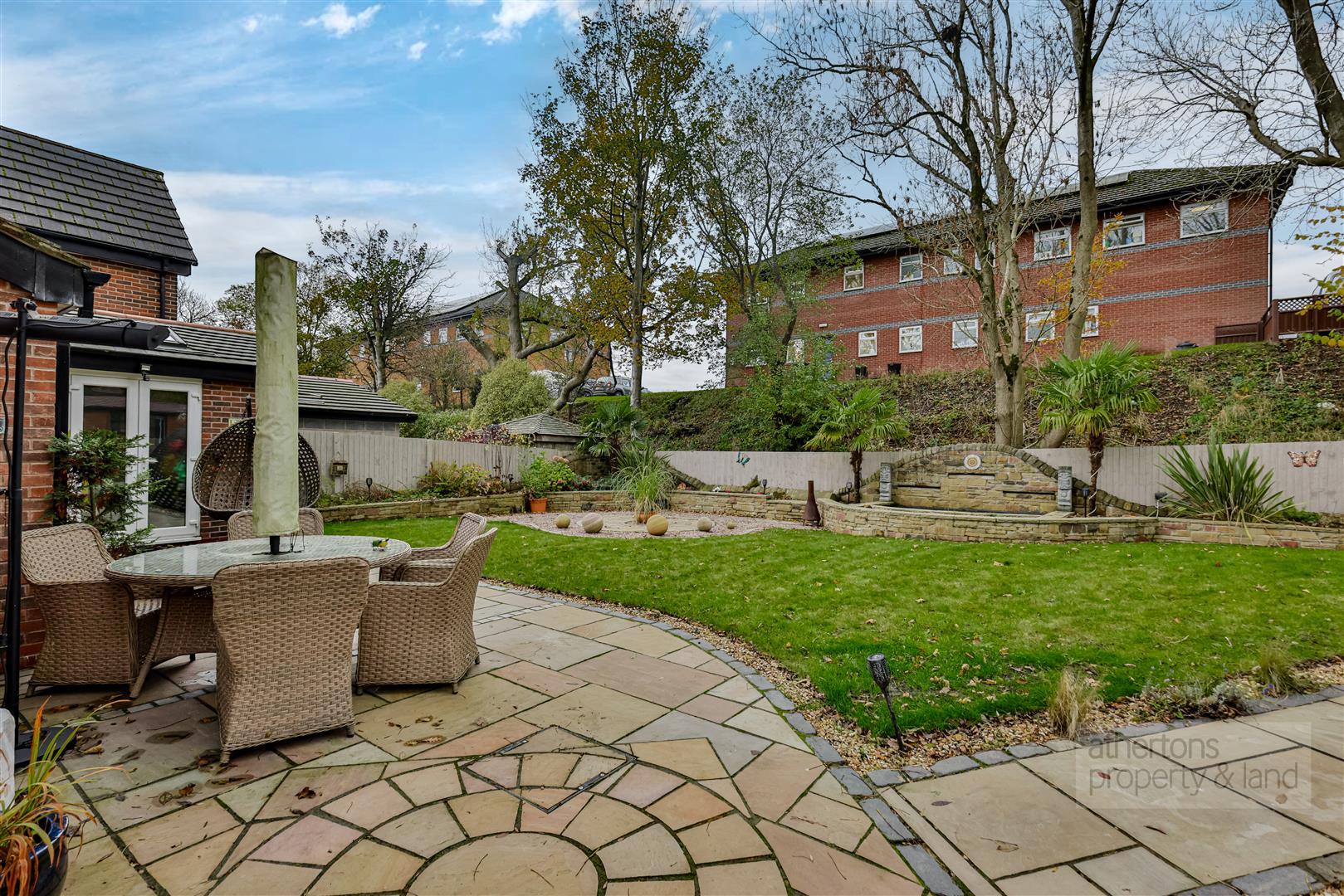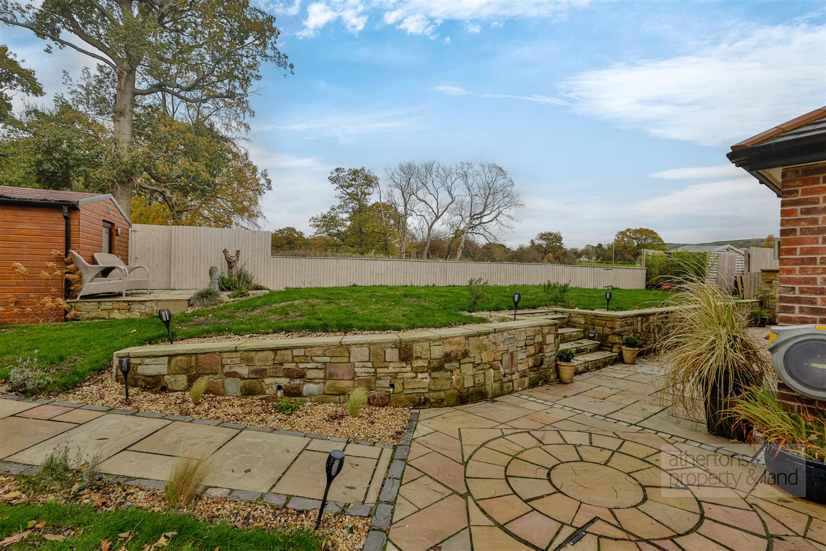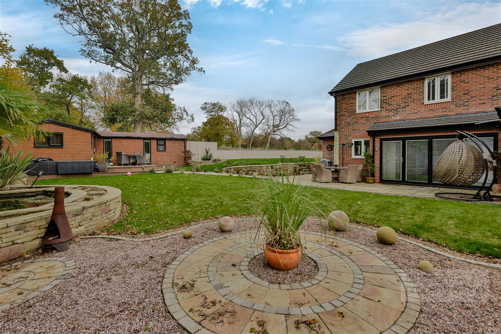 Externally, the property benefits from two tarmacadam driveway areas, providing extensive off-road parking and open access to the rear. The landscaped gardens wrap around the property, featuring split-level lawns, paved patios, and a stone pond with water feature. Fenced borders over adjoining fields offer excellent privacy, while the west-facing aspect ensures sunshine throughout the afternoon and evening.