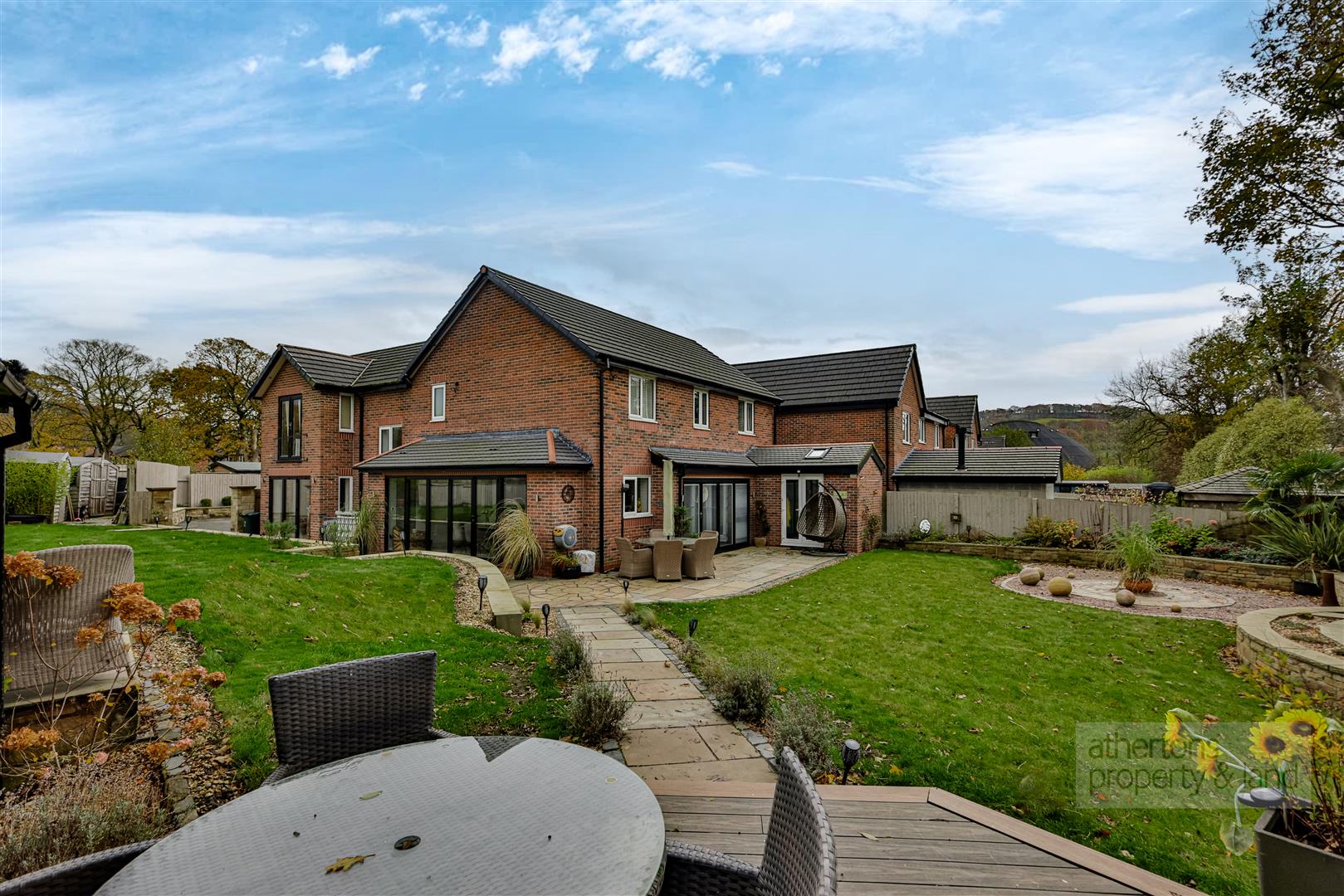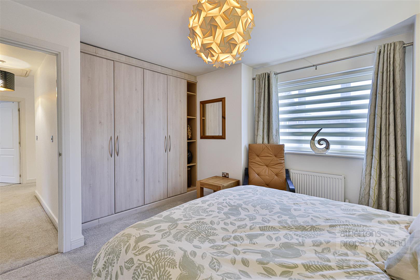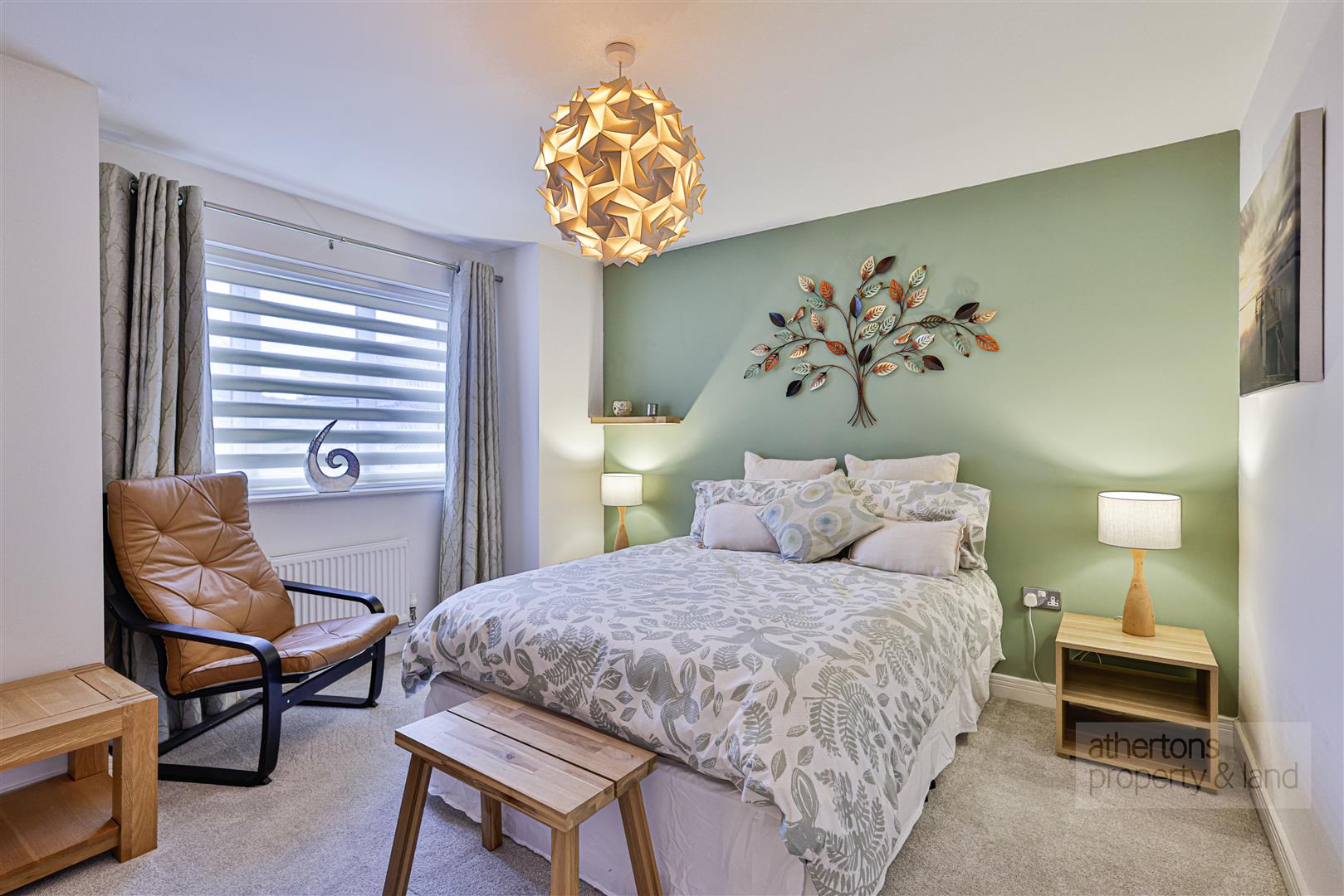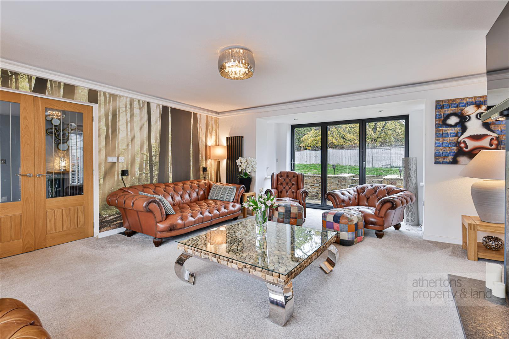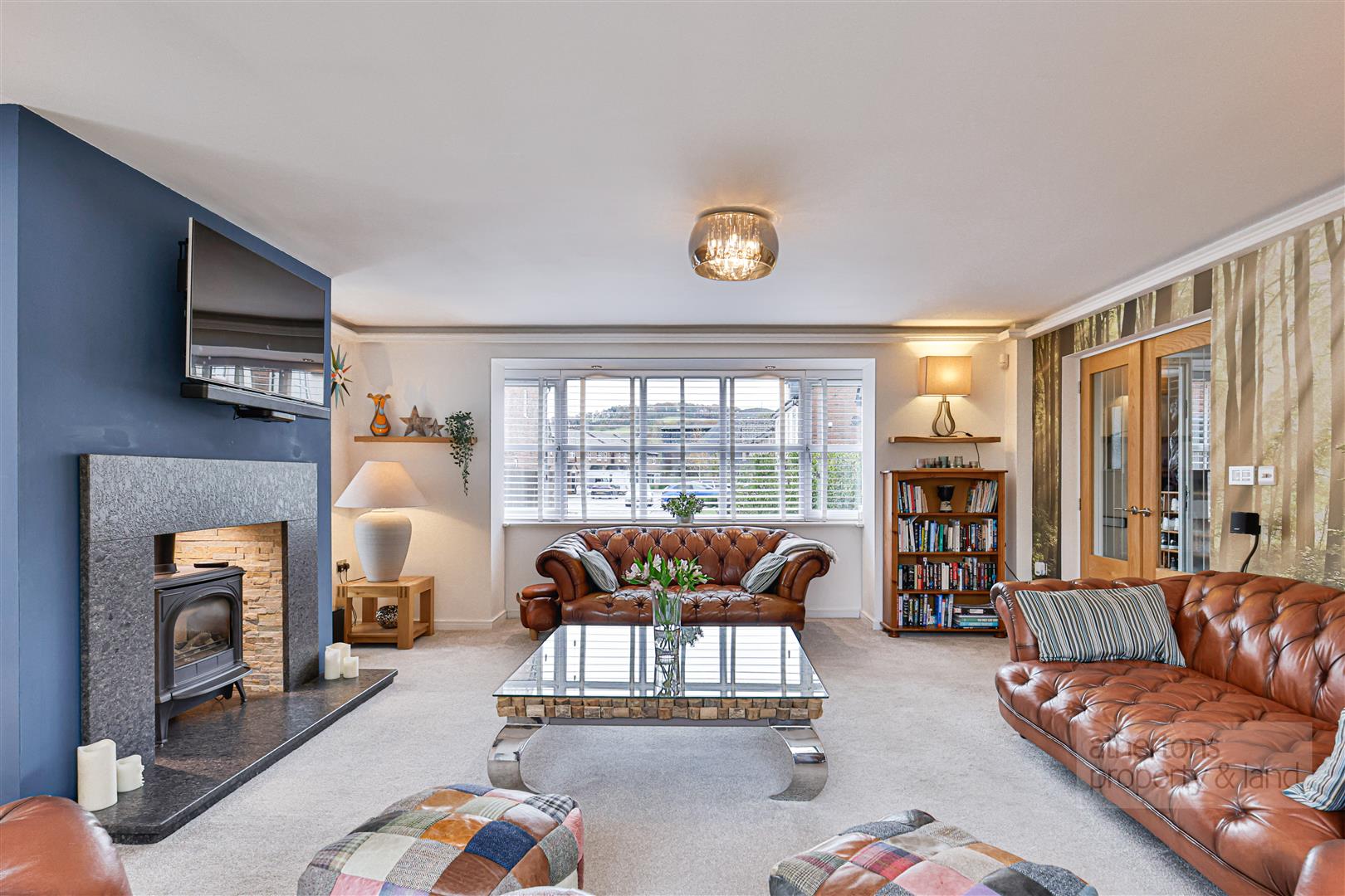 Externally, the property benefits from two tarmacadam driveway areas, providing extensive off-road parking and open access to the rear. The landscaped gardens wrap around the property, featuring split-level lawns, paved patios, and a stone pond with water feature. Fenced borders over adjoining fields offer excellent privacy, while the west-facing aspect ensures sunshine throughout the afternoon and evening.