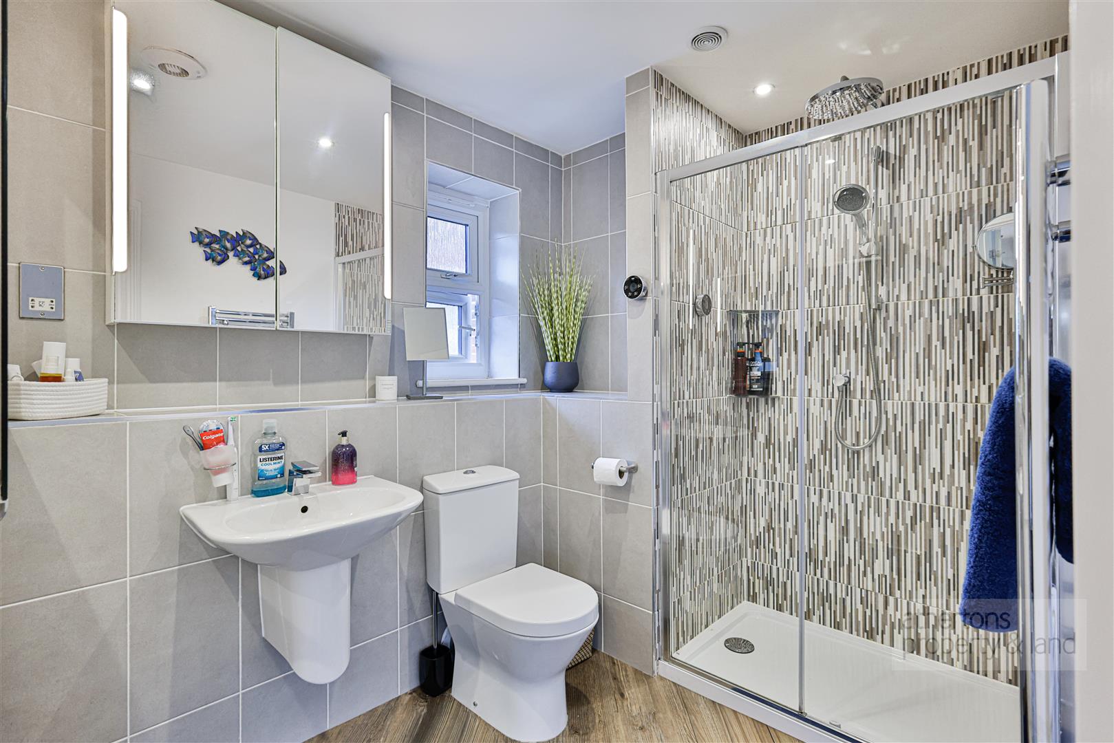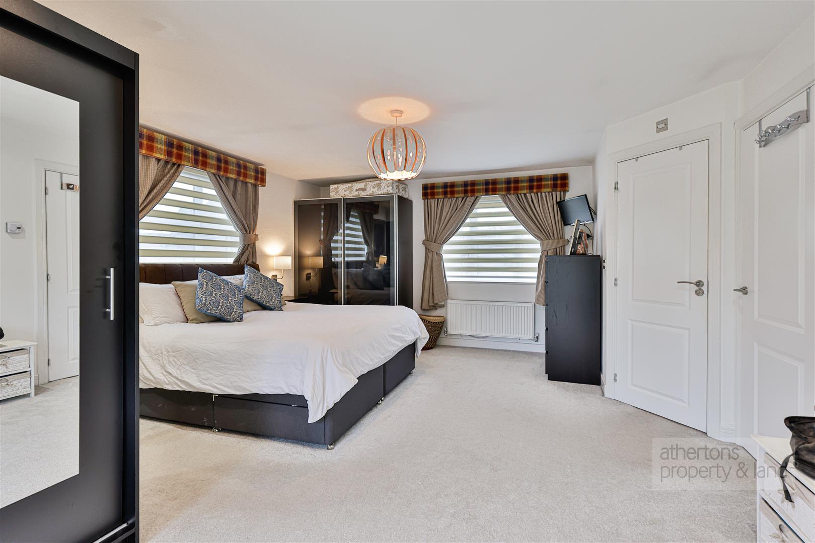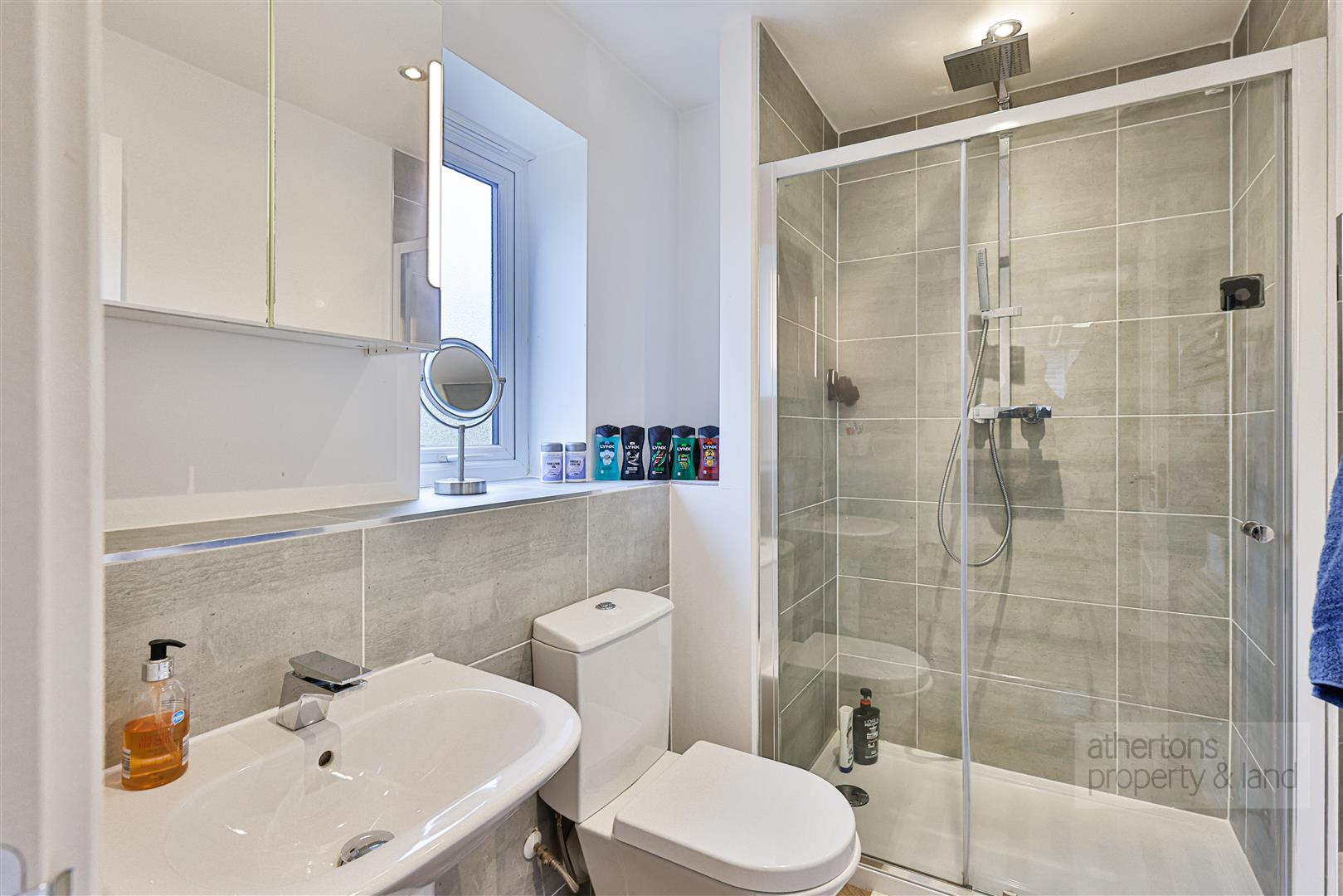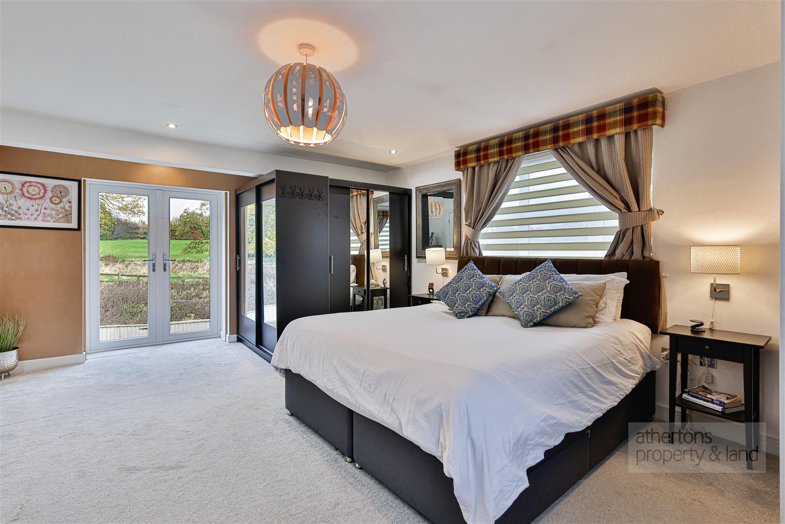 To the first floor, the principal bedroom suite enjoys a large bay window with a Juliette wrought-iron balcony offering open countryside views, ample space for wardrobe furniture, and a contemporary three-piece en-suite with walk-in shower and tiled elevations. A second double bedroom also features a private en-suite, while three further bedrooms—two with fitted wardrobes—are served by a modern four-piece family bathroom with a panelled bath and shower over, tiled elevations, walk-in shower cubicle, and alcove shelving.
