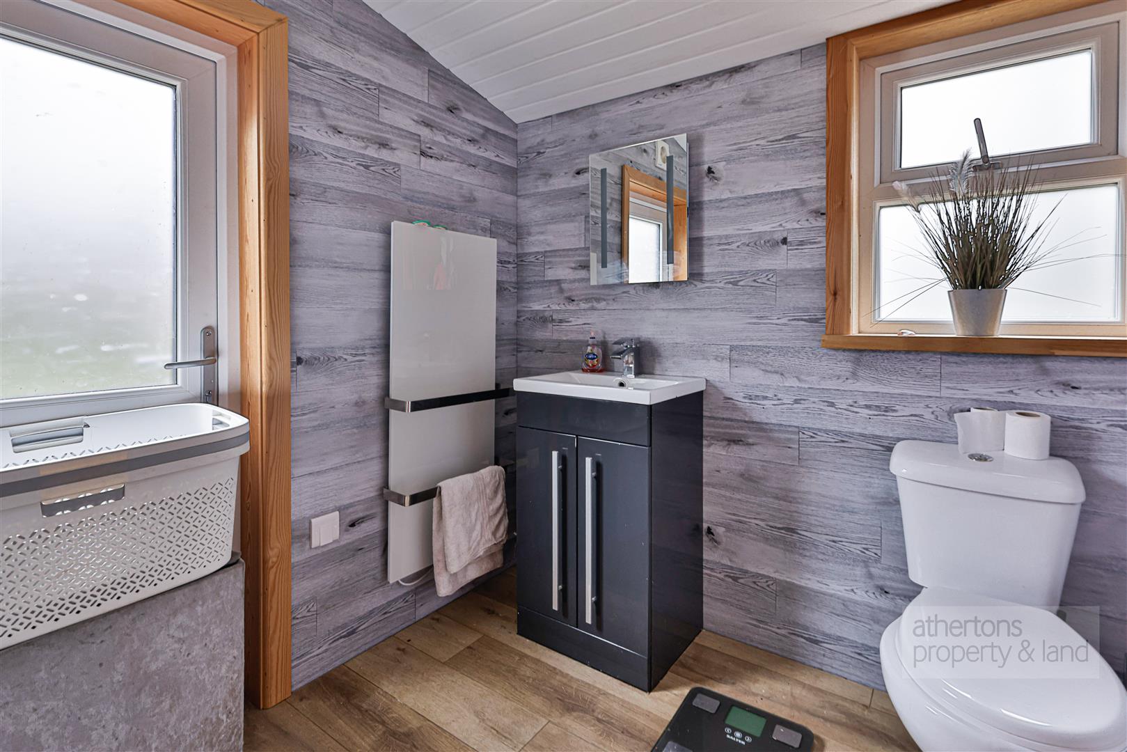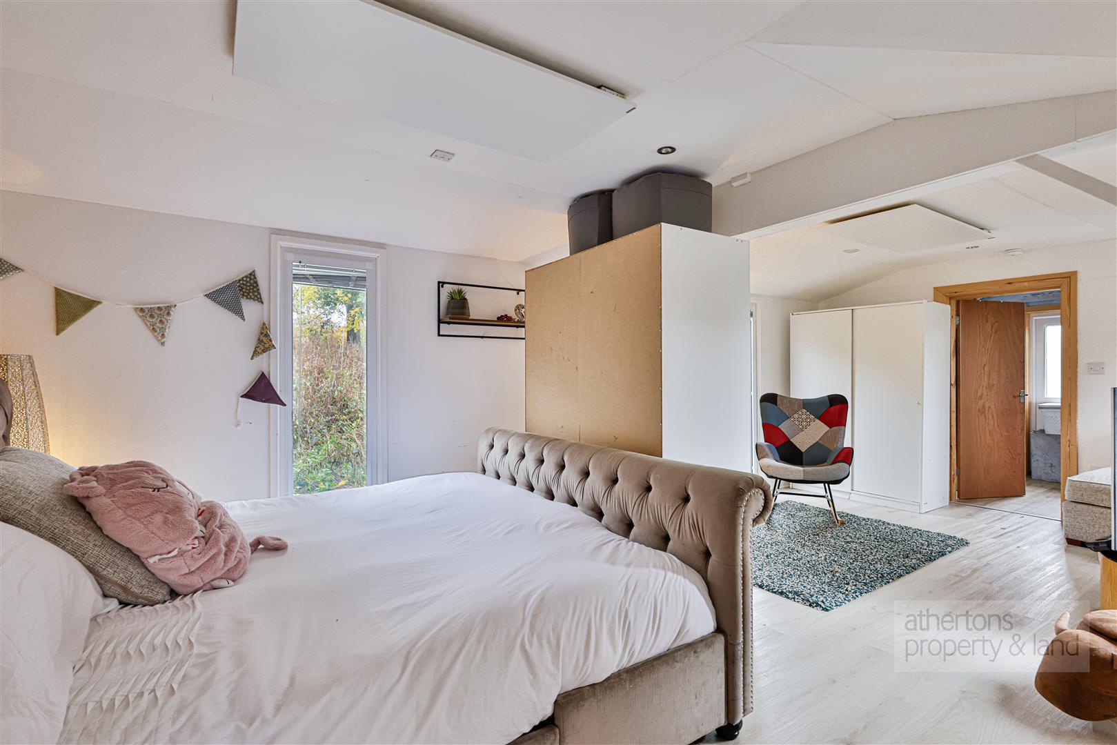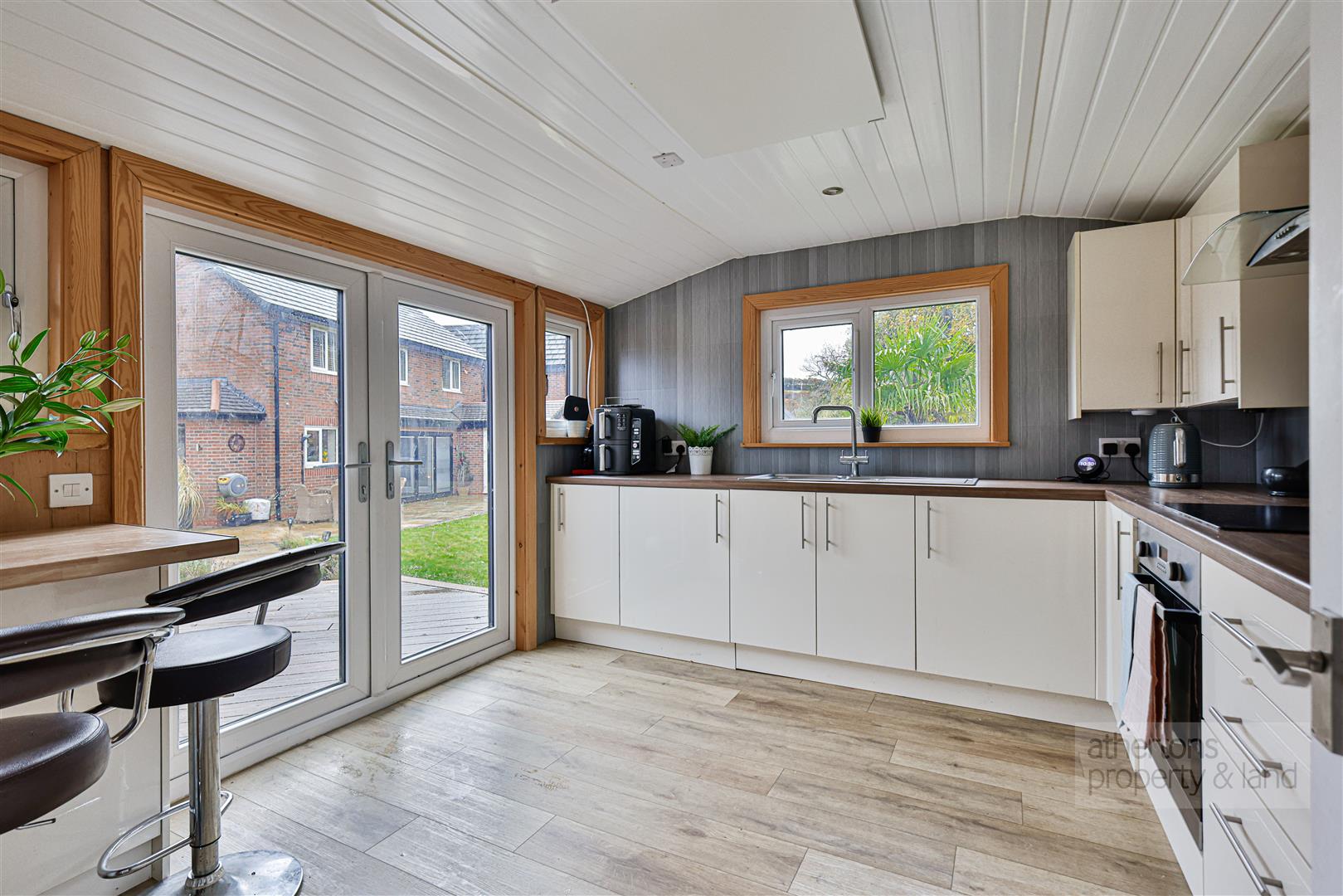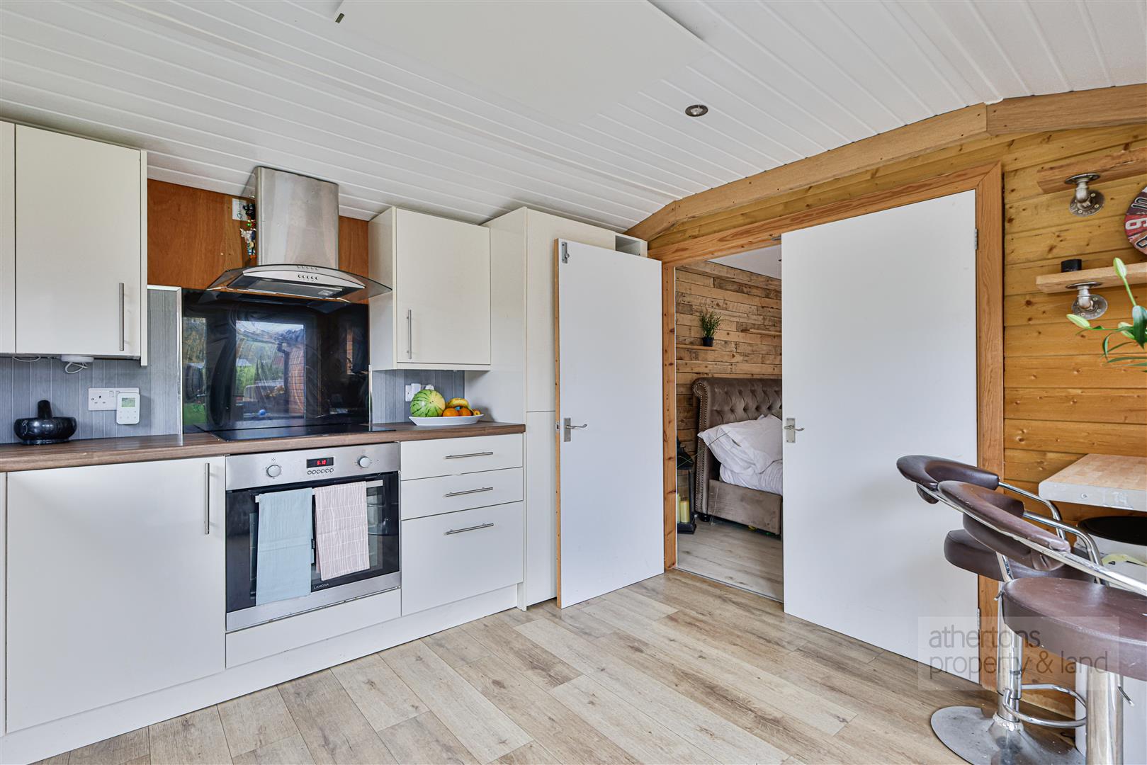 Positioned within the garden, the one-bedroom cabin/annexe offers an exceptional self-contained space comprising a breakfast kitchen with integrated appliances, an open-plan living and bedroom area, and an en-suite shower room with storage. Fully double-glazed, with electric heating and composite decking, it provides ideal accommodation for guests, independent family members, or home business use.
