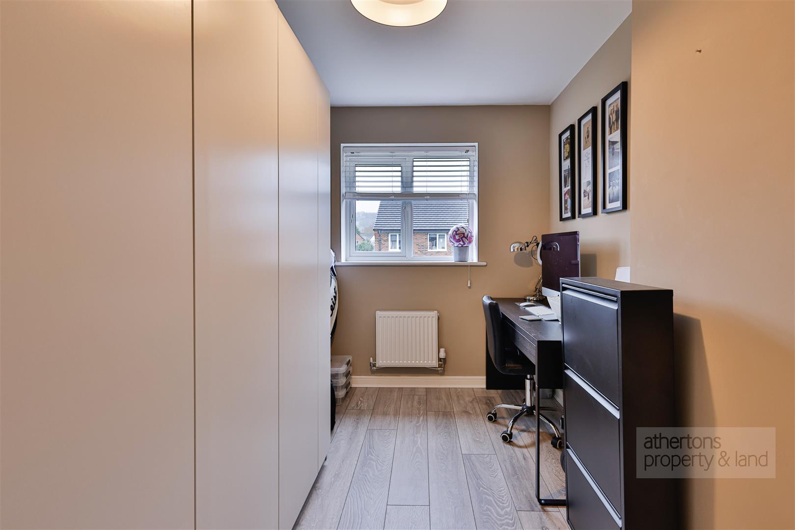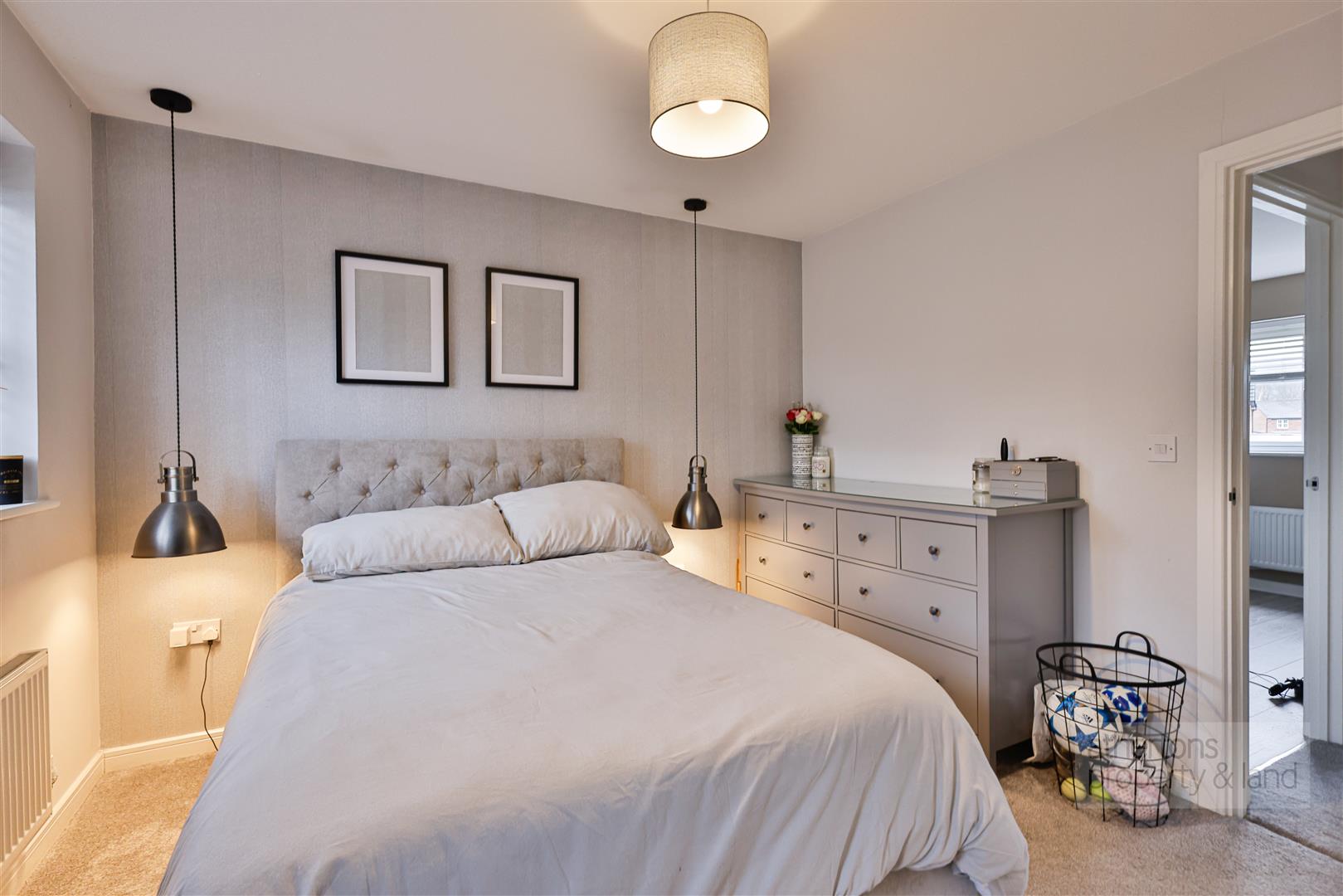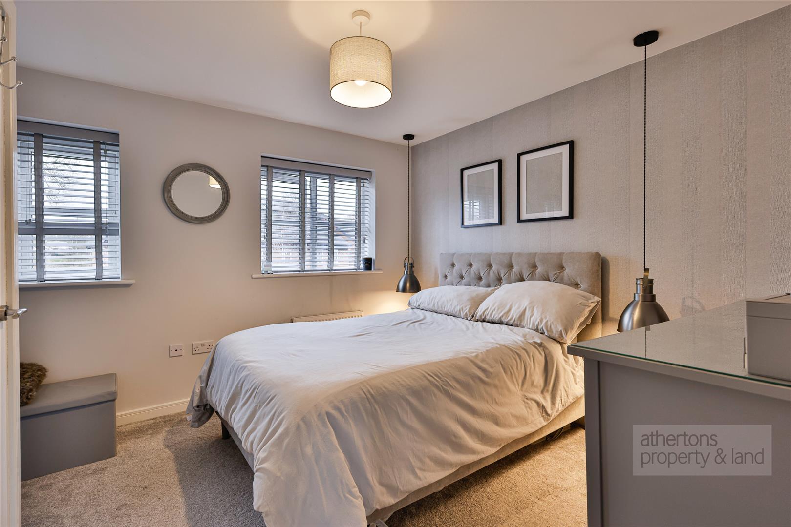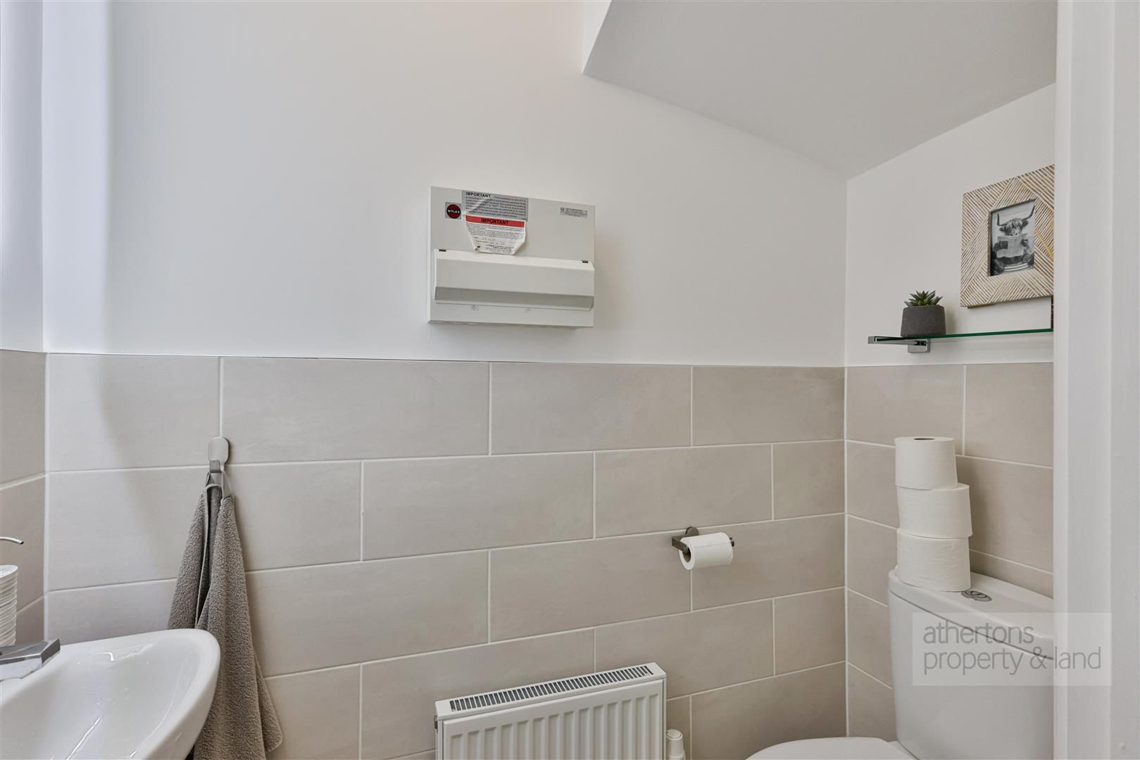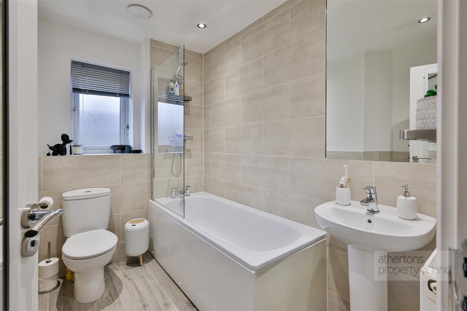 Stairs rise from the living room to the first floor, where there are two well-proportioned double bedrooms and a contemporary three-piece bathroom suite. The bathroom comprises a panelled bath with shower over, pedestal wash basin, and a dual-flush low-level WC.