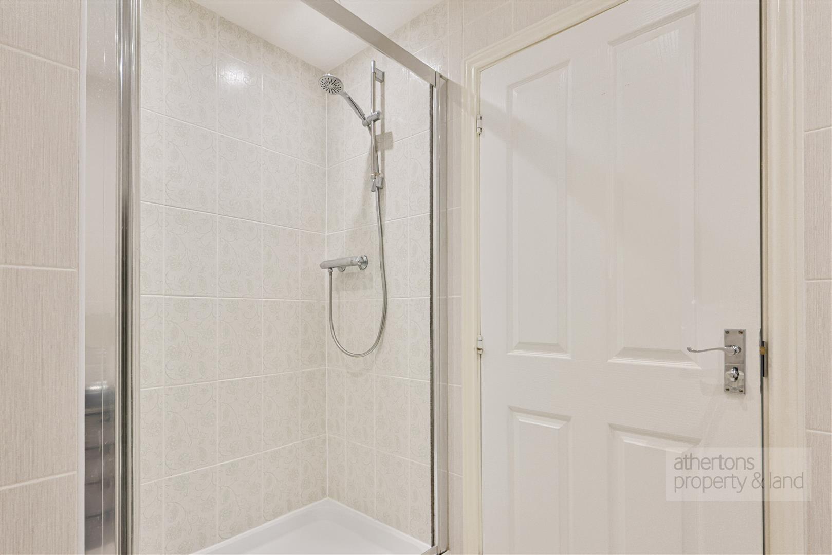 To the first floor, the landing provides access to all four bedrooms and the family bathroom, along with loft access and an airing cupboard housing the hot water cylinder. The principal bedroom is a spacious double and benefits from fitted wardrobes and a well-appointed en-suite shower room. The en-suite comprises a three-piece suite with tiled flooring and walls, pedestal wash basin, dual-flush WC, and a cubicle shower with a mains-fed shower.