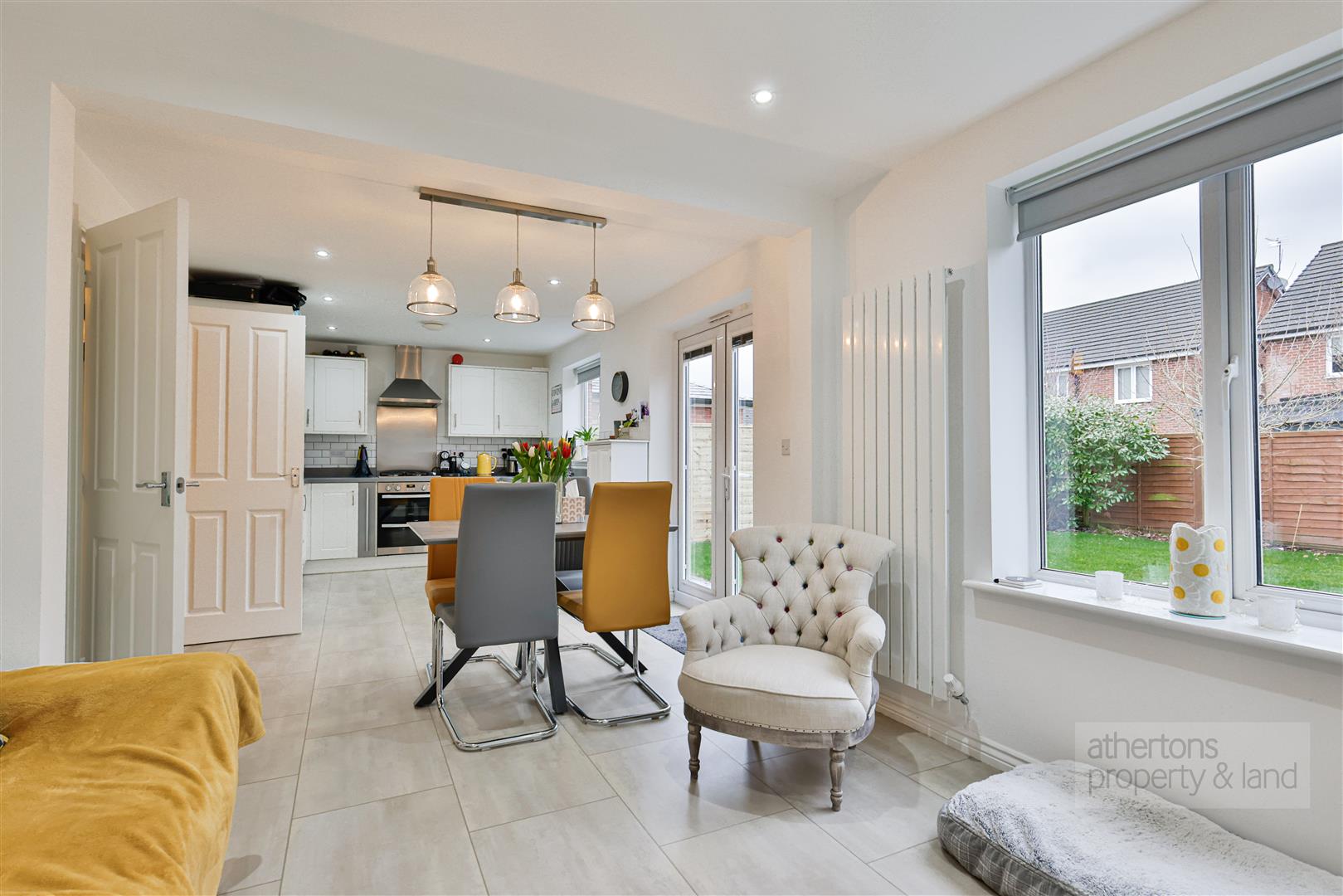 To the front of the property, the lounge provides a comfortable and welcoming retreat, featuring a bay window that fills the room with light. A feature fireplace with inset gas fire and stone surround forms a central focal point, adding warmth and character to the space.