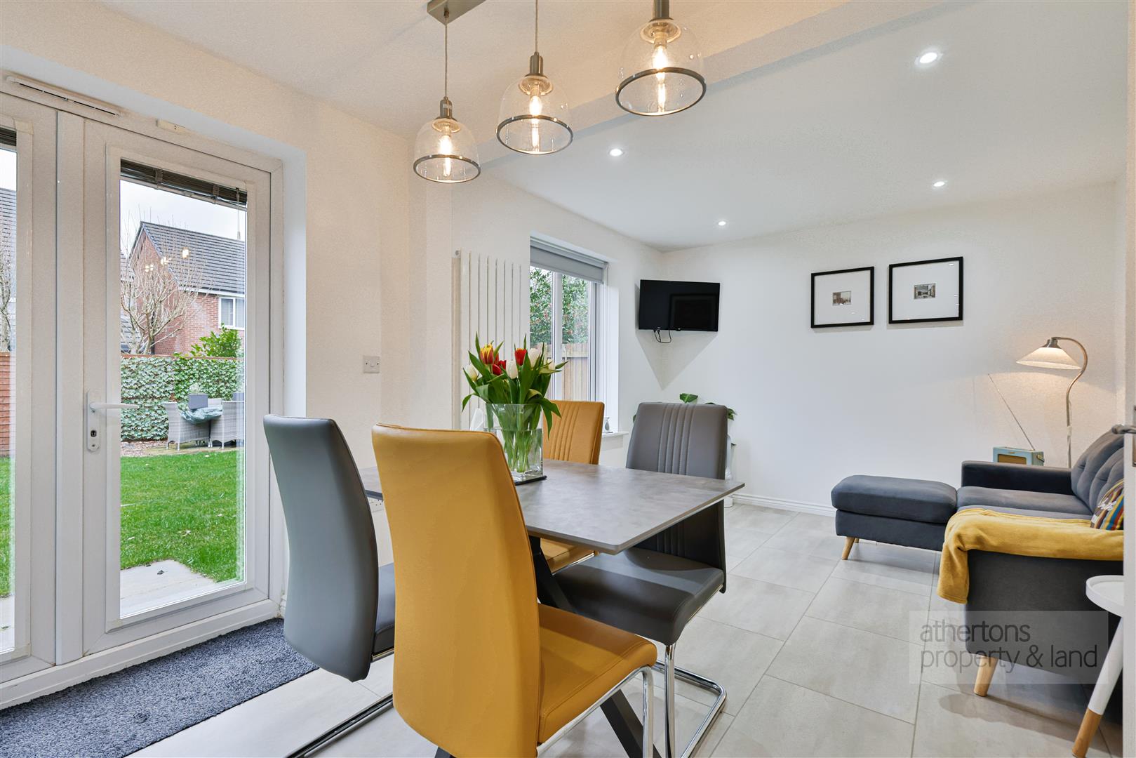 The heart of the home is the open-plan snug, kitchen, and dining area, designed to suit both everyday living and entertaining. The kitchen is fitted with shaker-style base and eye-level units complemented by laminate worktops and tiled splashbacks. Integrated appliances include a dishwasher and fridge/freezer, alongside a gas hob and electric double oven, with plumbing in place for a washing machine. Tiled flooring flows throughout the space, and French doors open directly onto the rear garden, allowing natural light to flood the room and creating a seamless connection to the outdoor seating areas.