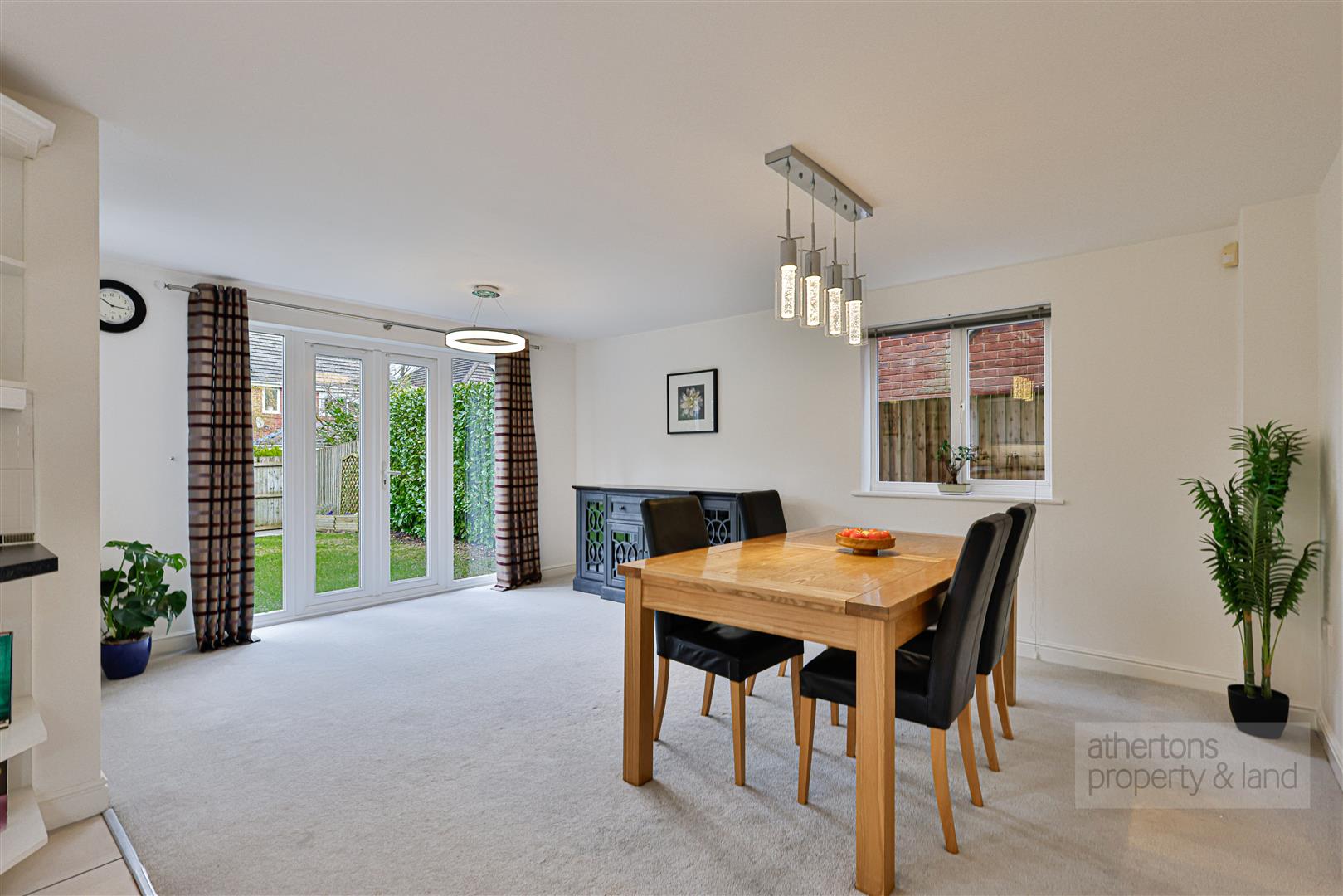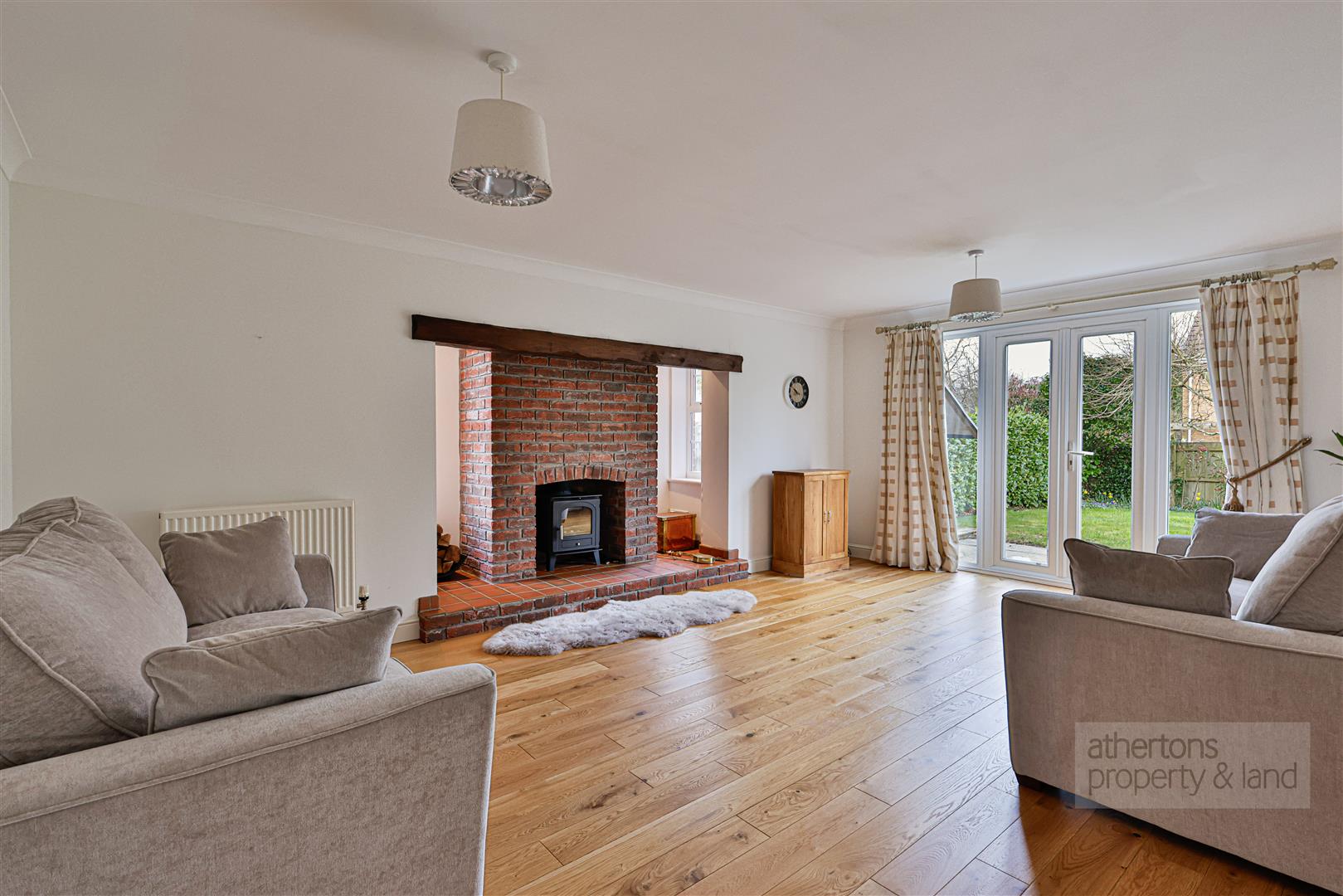 Upon entering, a welcoming entrance hall immediately sets the tone for the home, featuring a grand staircase, engineered oak flooring and useful under-stairs storage. The living room room is an elegant space, finished with engineered oak flooring and centred around a charming tiled and red brick fireplace with timber mantle and log burning stove, complemented by downlighting and French doors opening directly onto the rear garden.