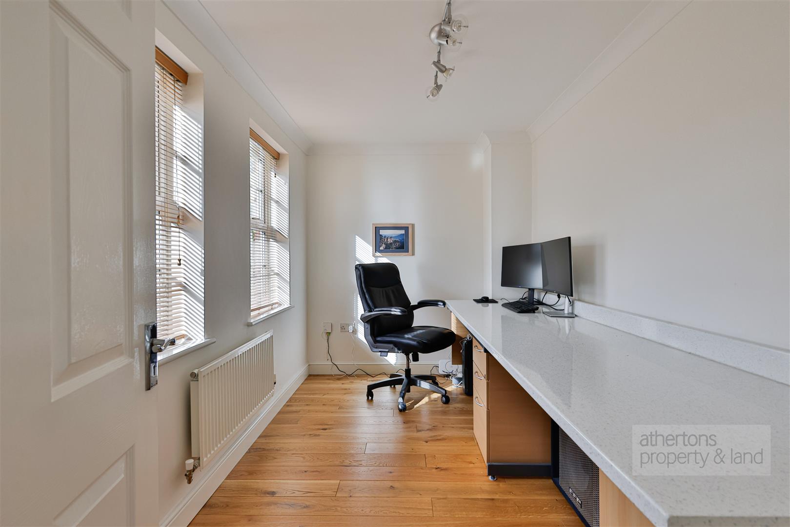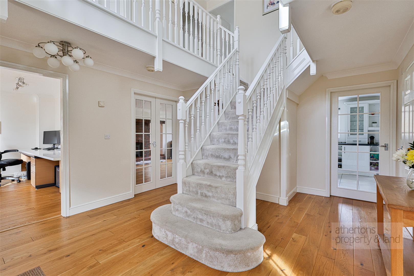 A separate home office provides an excellent work-from-home space with engineered oak flooring and fitted desk furniture, while an additional snug offers a versatile reception room ideal as a children’s playroom, second sitting room or informal lounge, finished with recently laid carpets. A convenient 2pc ground floor WC is located just off the hallway.