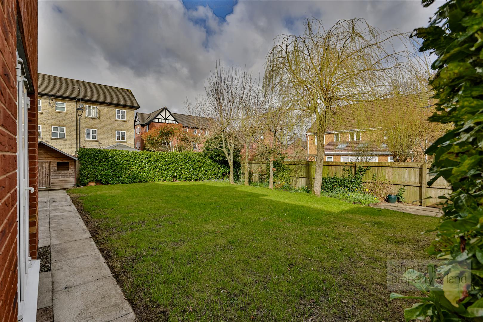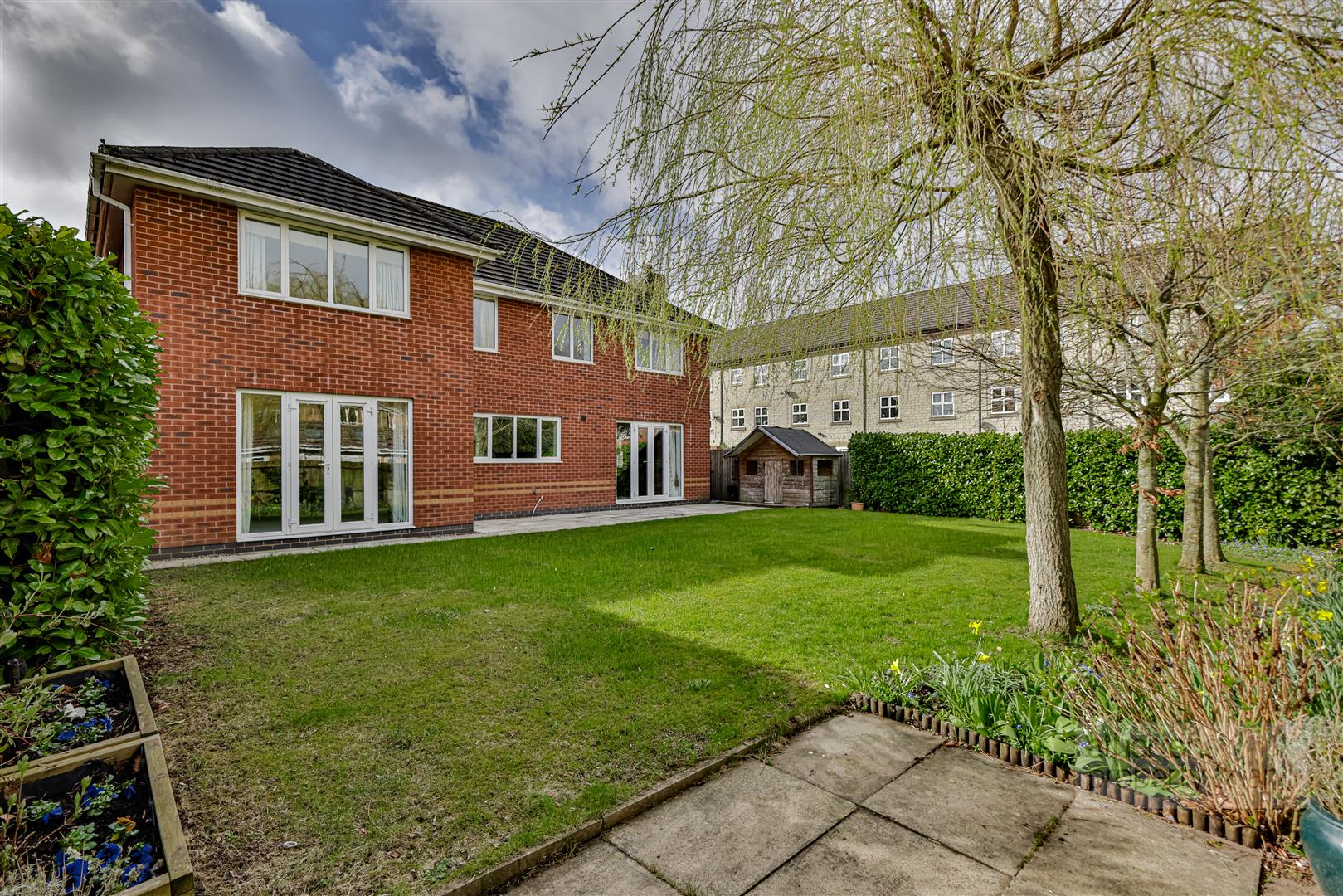 Externally, the property enjoys a private rear garden predominantly laid to lawn with a stone paved patio area, ideal for outdoor seating and entertaining. The garden is bordered by mature laurel and tree-lined planting with additional gravel areas and a timber children's play house or useful storage structure to the side.