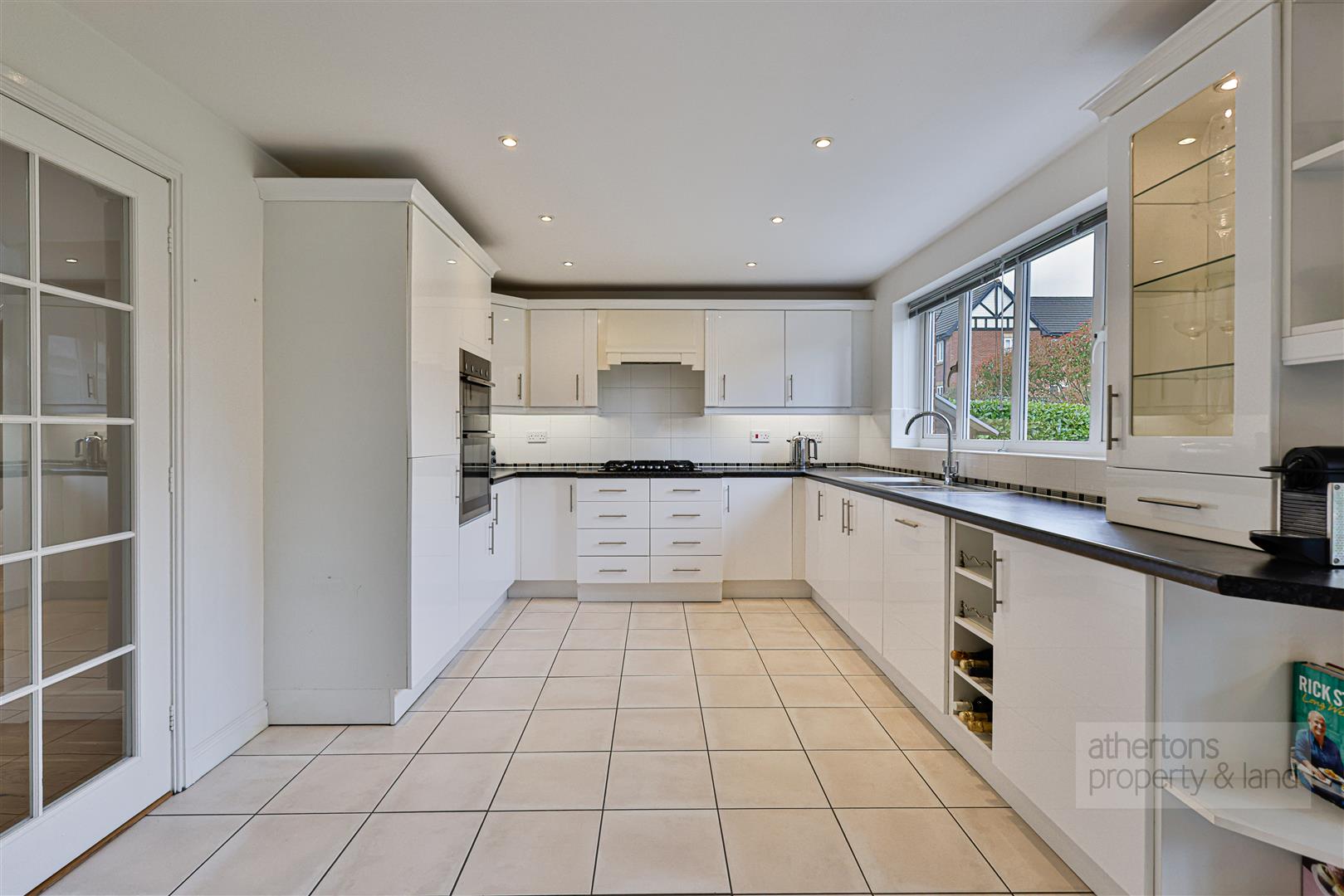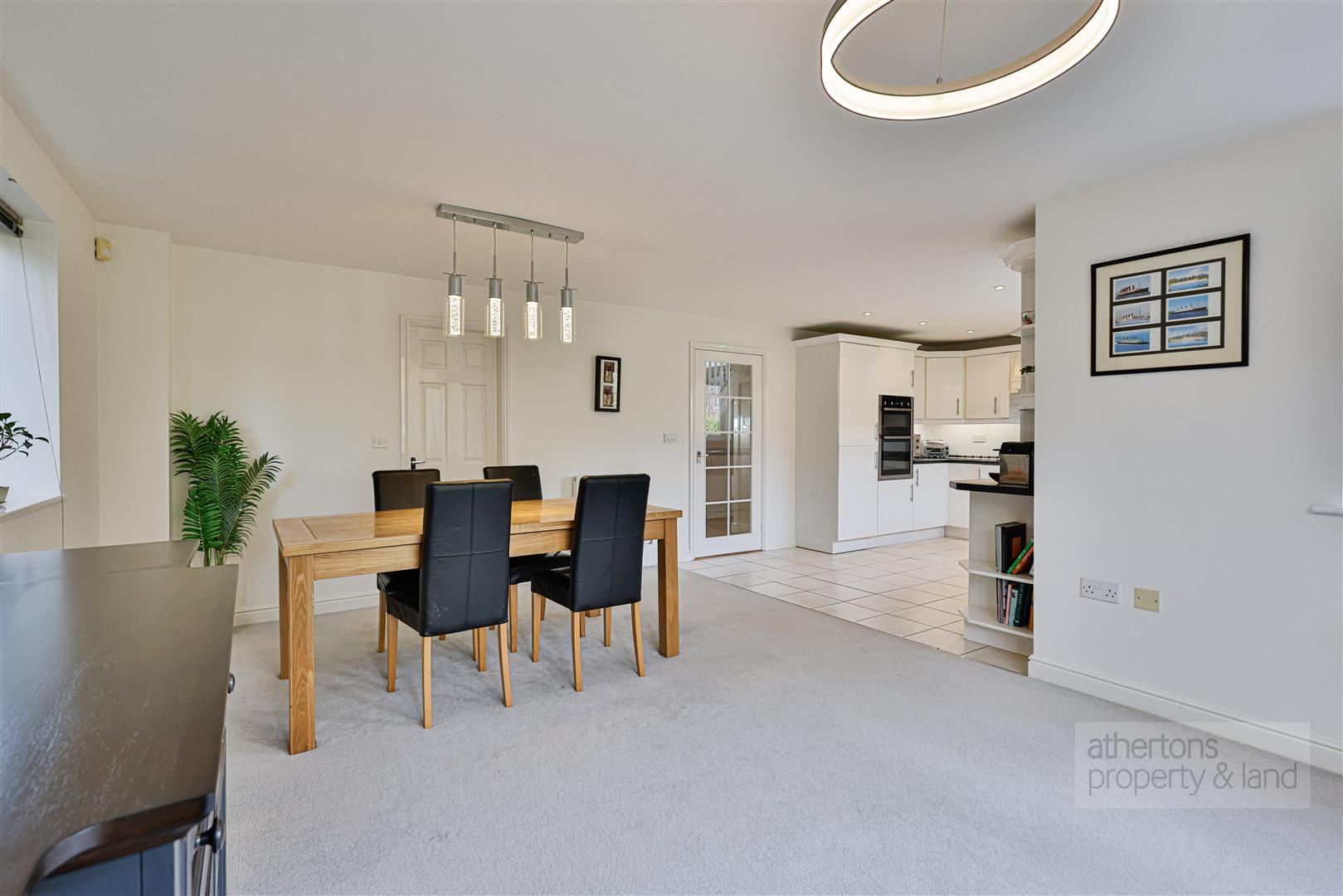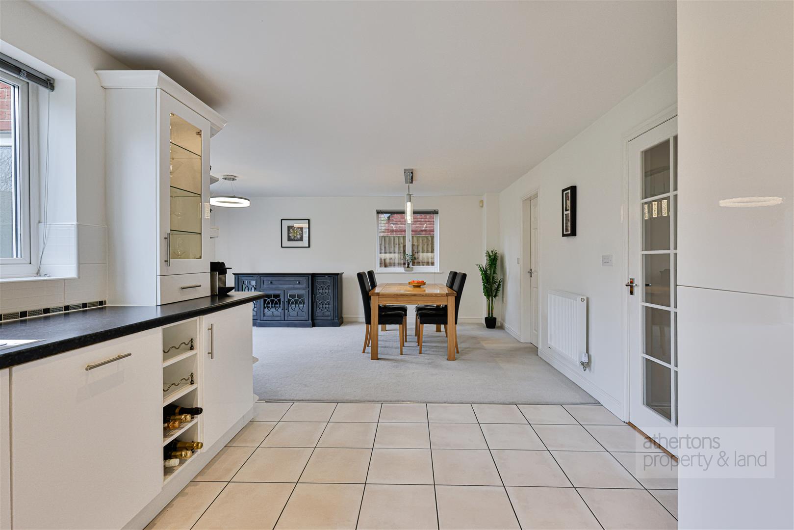 To the rear of the property lies a particularly impressive open-plan kitchen and dining area, arranged in a generous L-shaped layout. The kitchen area features tiled flooring and a range of sleek white base and eye-level units with laminate worktops, a stainless steel dual bowl sink, integrated appliances including a Neff double oven, KitchenAid five ring gas hob and dishwasher. The dining area provides ample space for a large dining table and additional furniture, with French doors opening out to the rear garden, making it ideal for family life and entertaining. A practical utility room sits just off the kitchen with matching base units, sink, Ideal gas boiler, plumbing for a washing machine and dryer, and an external door leading outside.