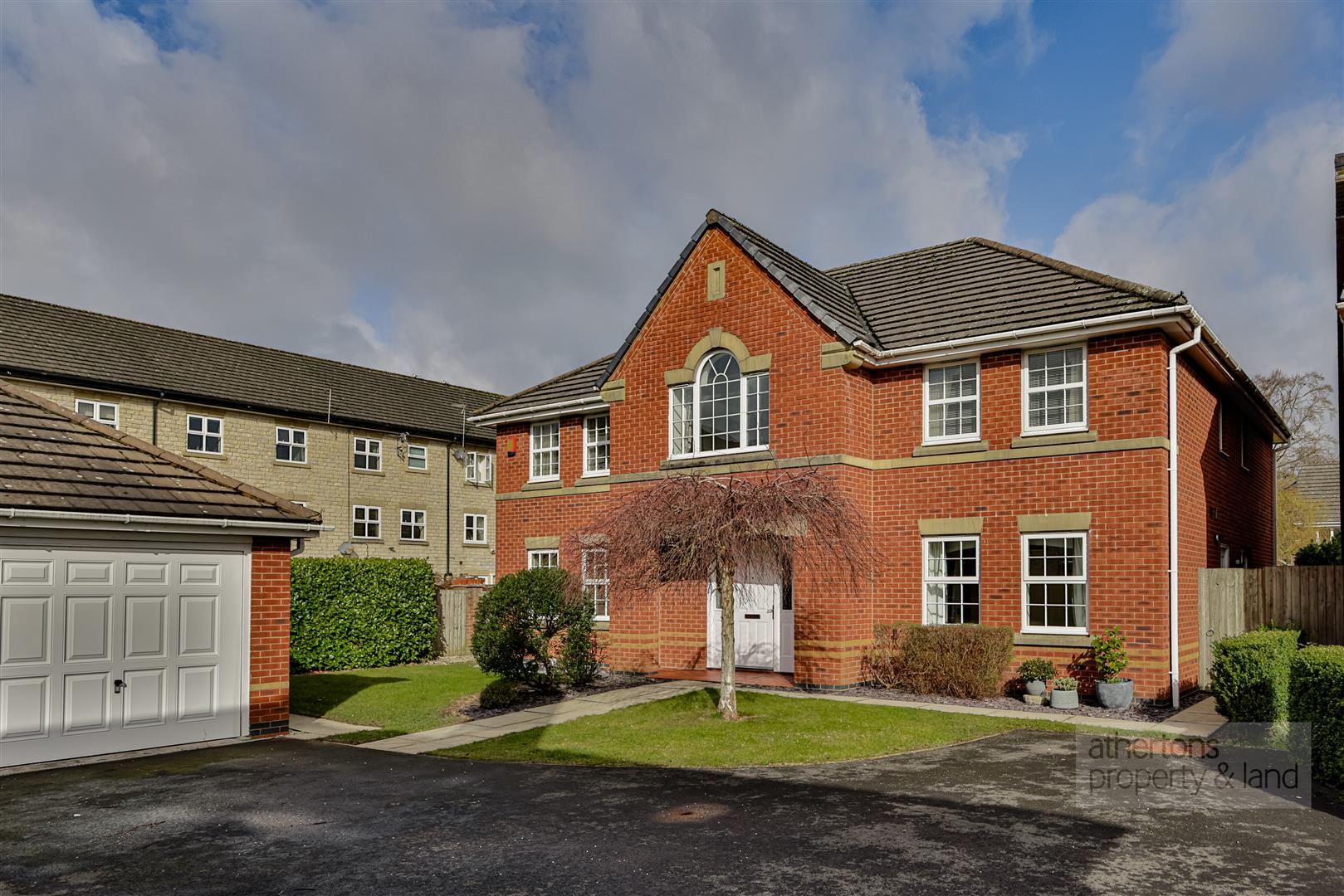 The property is approached via an uncommonly large driveway providing parking for several vehicles and leading to a detached double garage with two up-and-over doors, power and lighting. The front gardens are neatly lawned with well-kept borders, while a stone paved pathway leads around the property to a sheltered open porch.