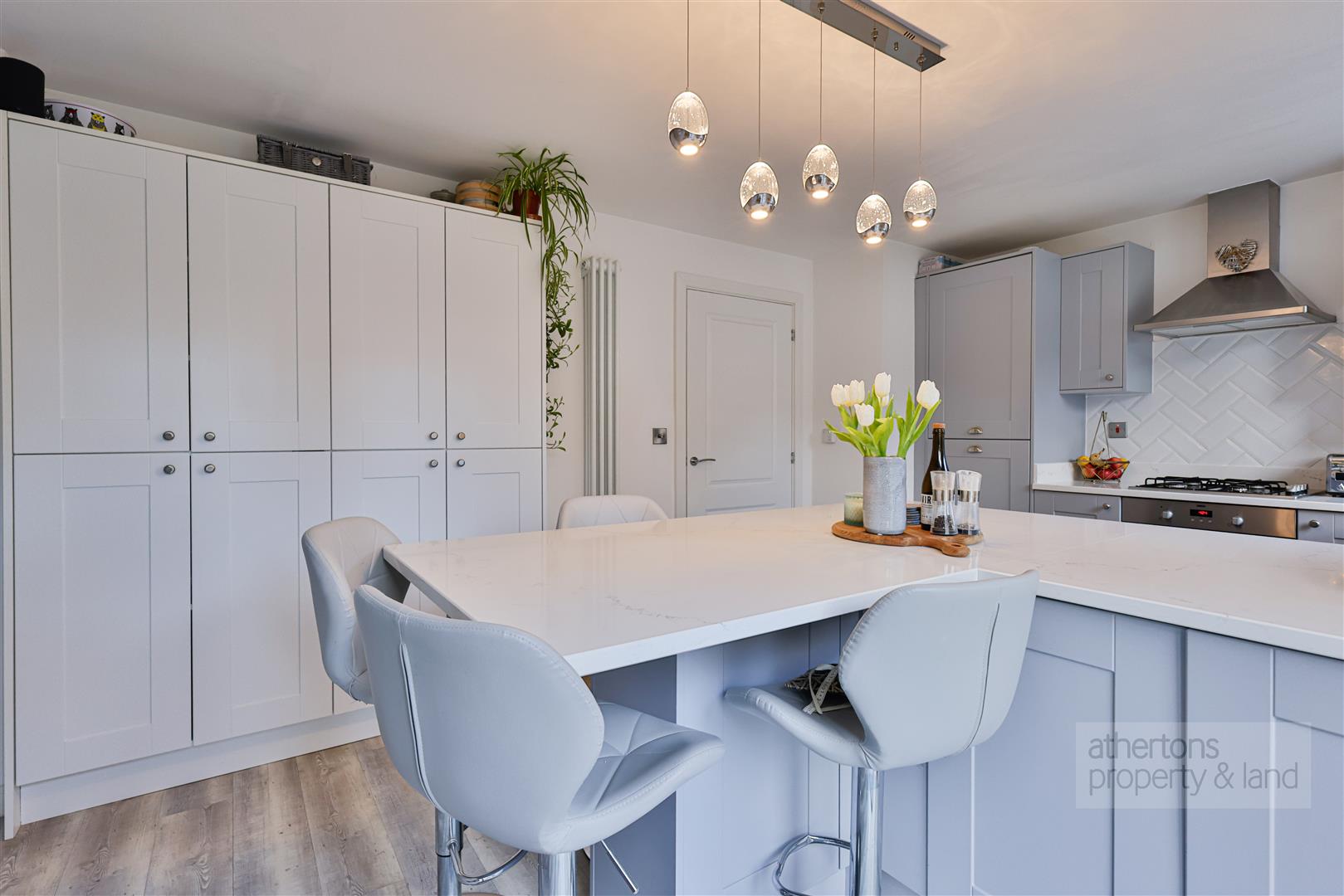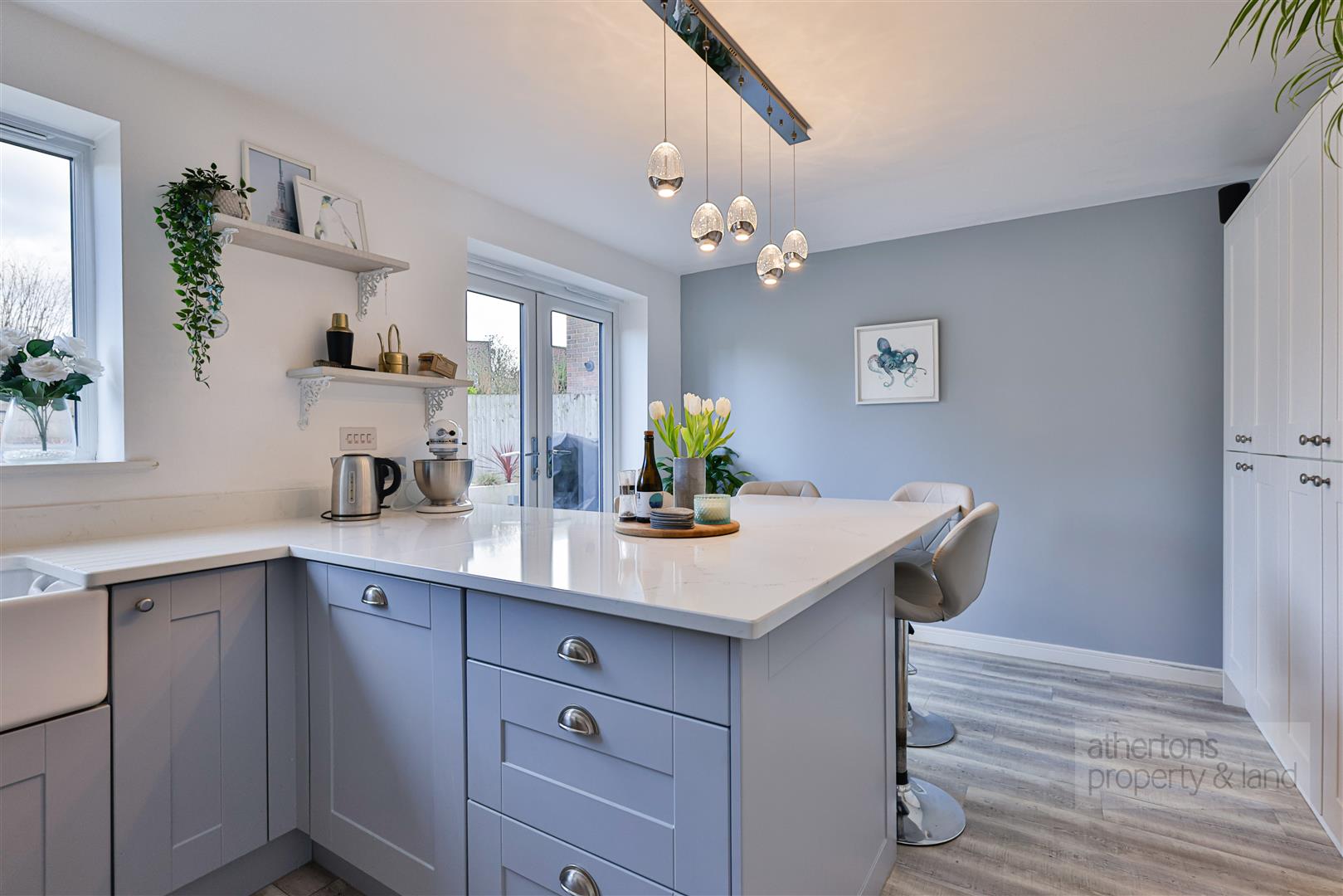 To the rear, the open-plan kitchen and dining area has been upgraded to a high specification. The kitchen now offers additional worktop space with stylish quartz surfaces, a practical breakfast bar, and an array of enhanced storage including additional pantry cupboards. Finished with modern base and eye-level units, LE backlighting, the kitchen includes a four-ring gas hob with extractor above, electric oven, integrated fridge/freezer, dishwasher, washing machine, and a Belfast sink. French doors open directly onto the rear decking area.