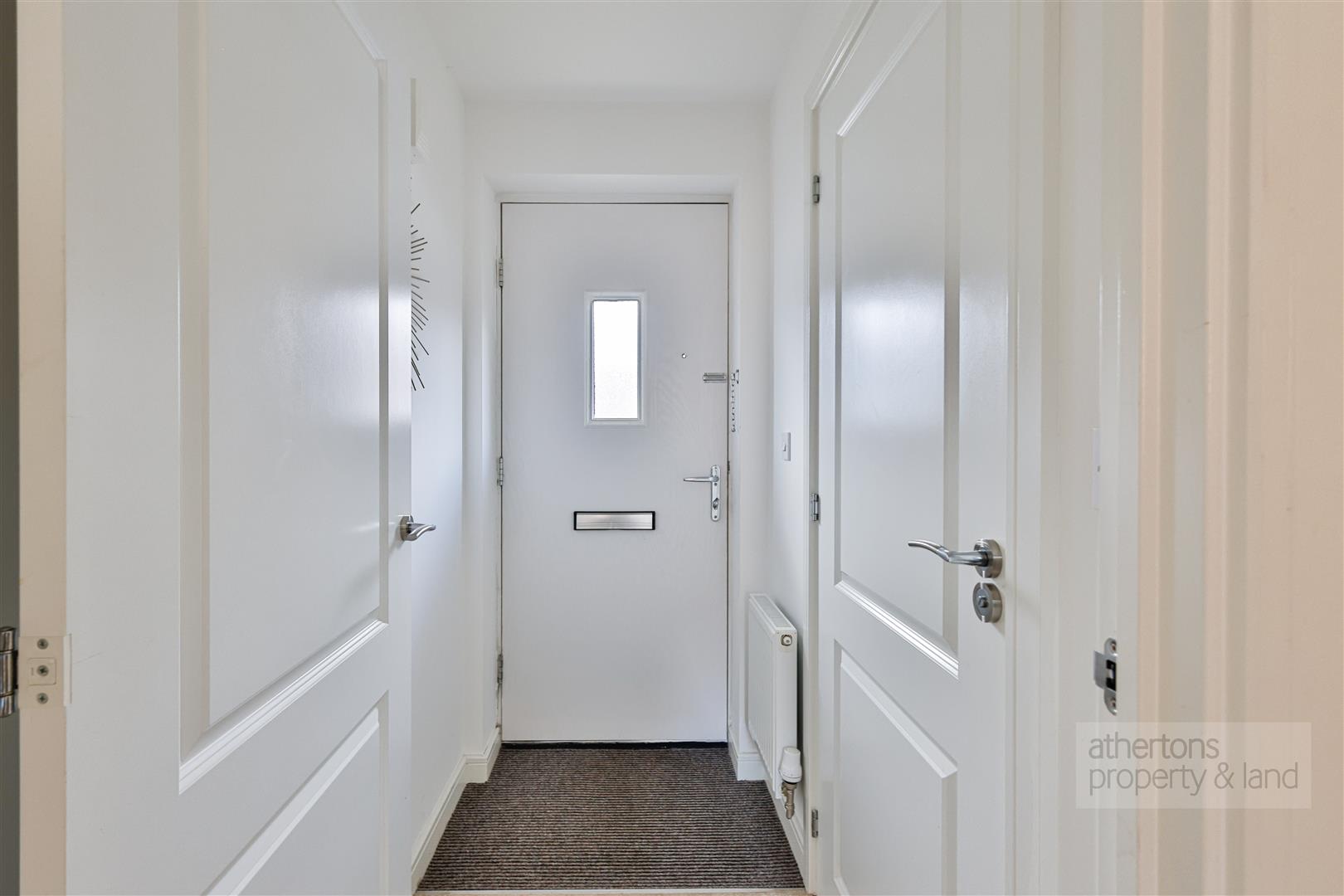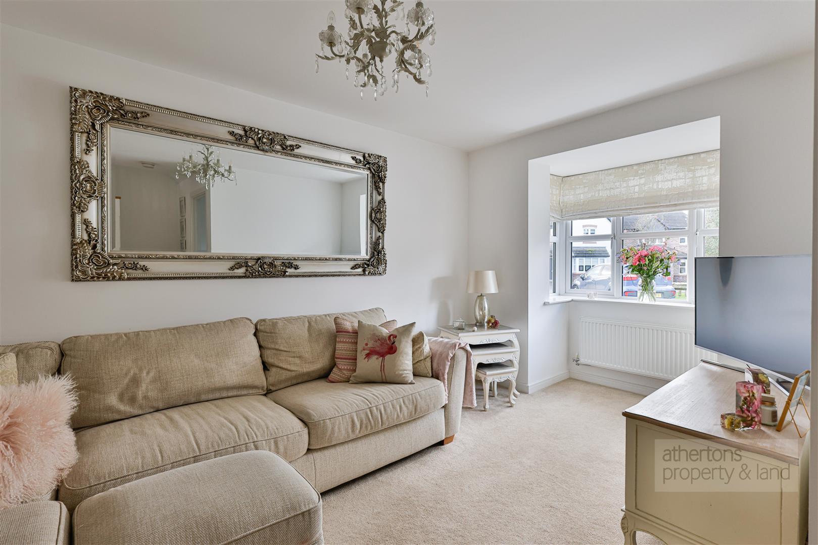 Upon entering, a welcoming entrance porch provides access to a contemporary two-piece cloakroom comprising a dual flush WC and pedestal wash basin. The main living room is positioned to the front of the property and features a box bay window that floods the space with natural light, along with useful under-stairs storage and ample room for a range of lounge furniture.