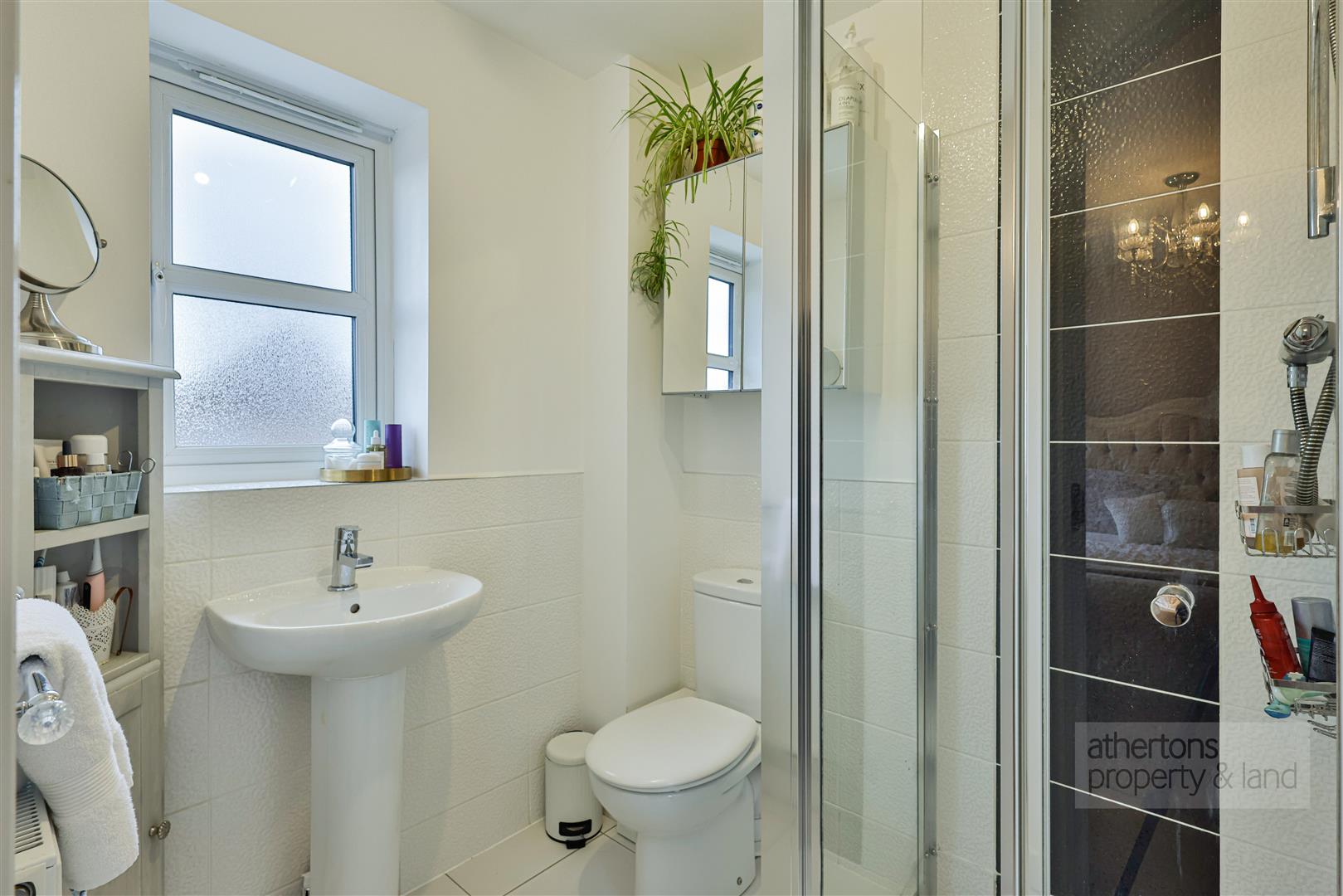 The first floor comprises a spacious landing with built-in storage housing the hot water cylinder. The main bedroom is a generous double featuring an over-stairs storage cupboard and a modern en-suite shower room with contemporary tiling, corner shower cubicle, WC and wash basin. Bedroom two is a comfortable double overlooking the rear garden, while bedroom three is a well-proportioned single benefiting from fitted wardrobes, making it ideal as a child’s bedroom, dressing room, or home office. These rooms are served by a well-appointed family bathroom with half-tiled walls, a panelled bath, dual flush WC and pedestal wash basin.
