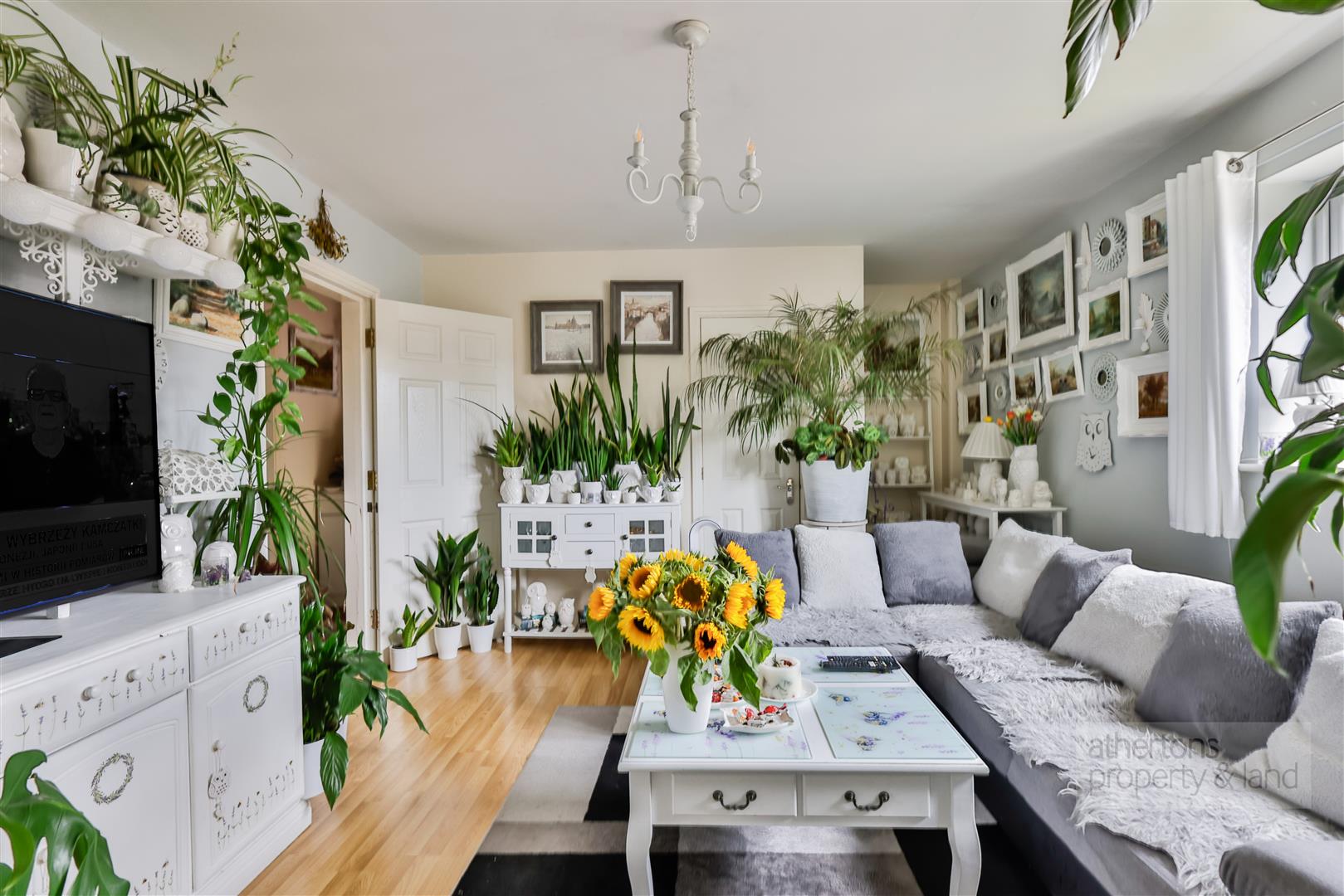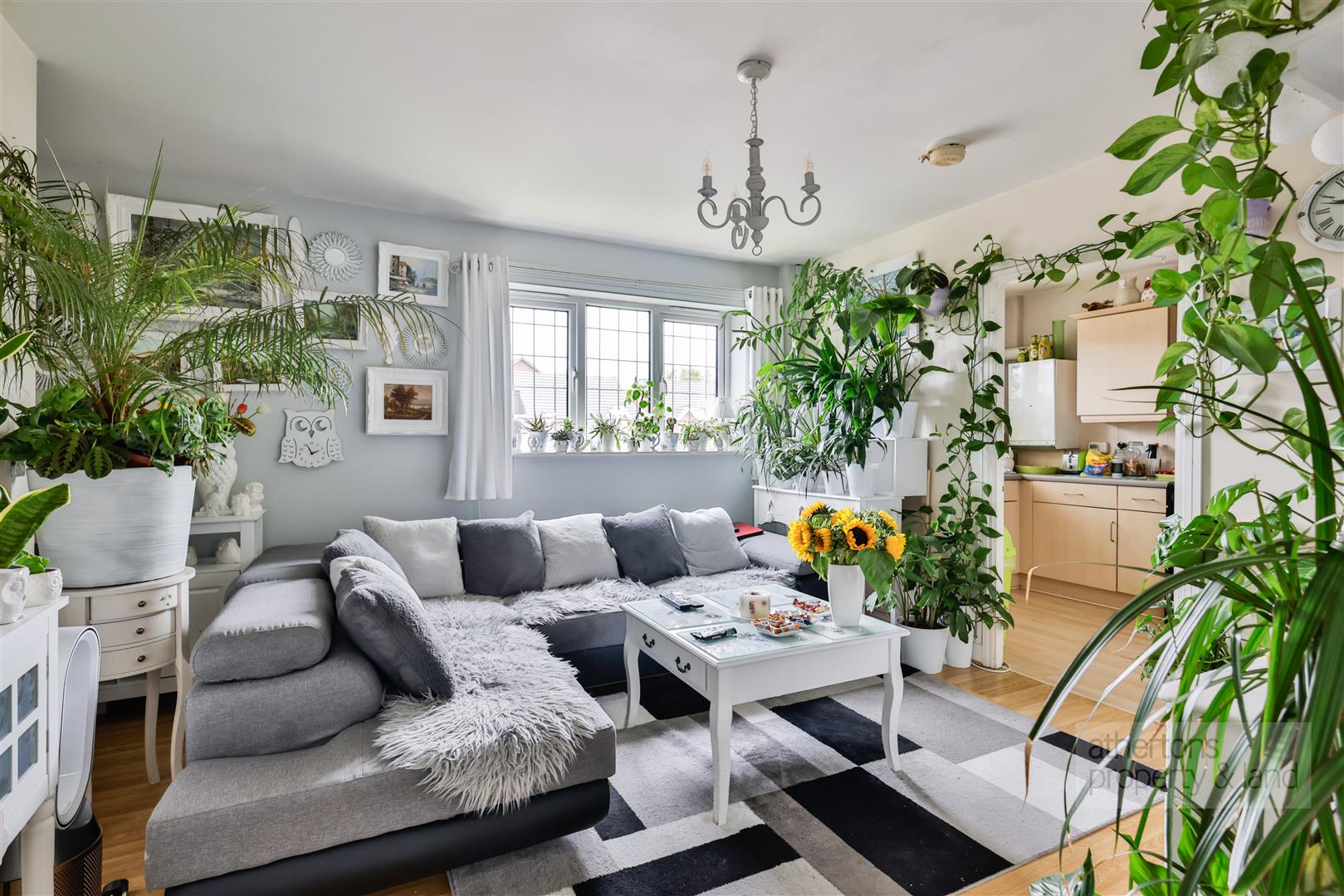 Inside, a private entrance hall and staircase lead up to the main accommodation, where a welcoming hallway connects each of the principal rooms. To the front of the property, the spacious living room enjoys an abundance of natural light through a large UPVC double-glazed window and is fitted with satellite, telephone, and TV points.