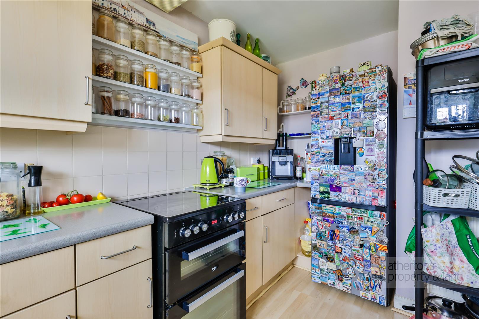 Adjoining the living area, the contemporary kitchen features sleek beech-effect cabinetry with chrome handles, laminate work surfaces, and appliances including a four-ring gas hob, double oven and grill, plumbing for washing machine, and space for fridge-freezer. A combination boiler is neatly housed in a cupboard, and the kitchen is finished with a one-and-a-half bowl sink with drainer, inset low-energy lighting, and a double-glazed window.