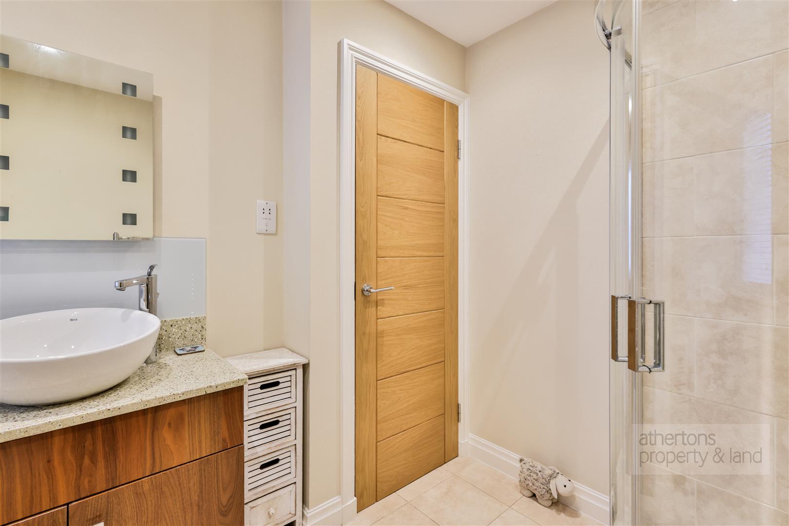 The ground floor also offers exceptional flexibility, with a multi-purpose bedroom/snug ideally suited for a dependent relative, teenager, or additional reception space. This comprises a generous family/bedroom with fitted bookcase, walk-in wardrobe, and stunning views, together with a contemporary en-suite shower room featuring rainfall shower, vanity wash basin, WC, tiled flooring, and underfloor heating. A stylish two-piece cloakroom completes the ground floor accommodation.