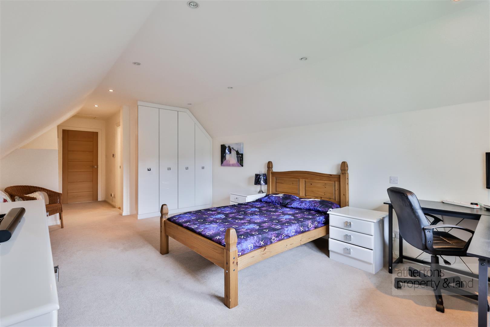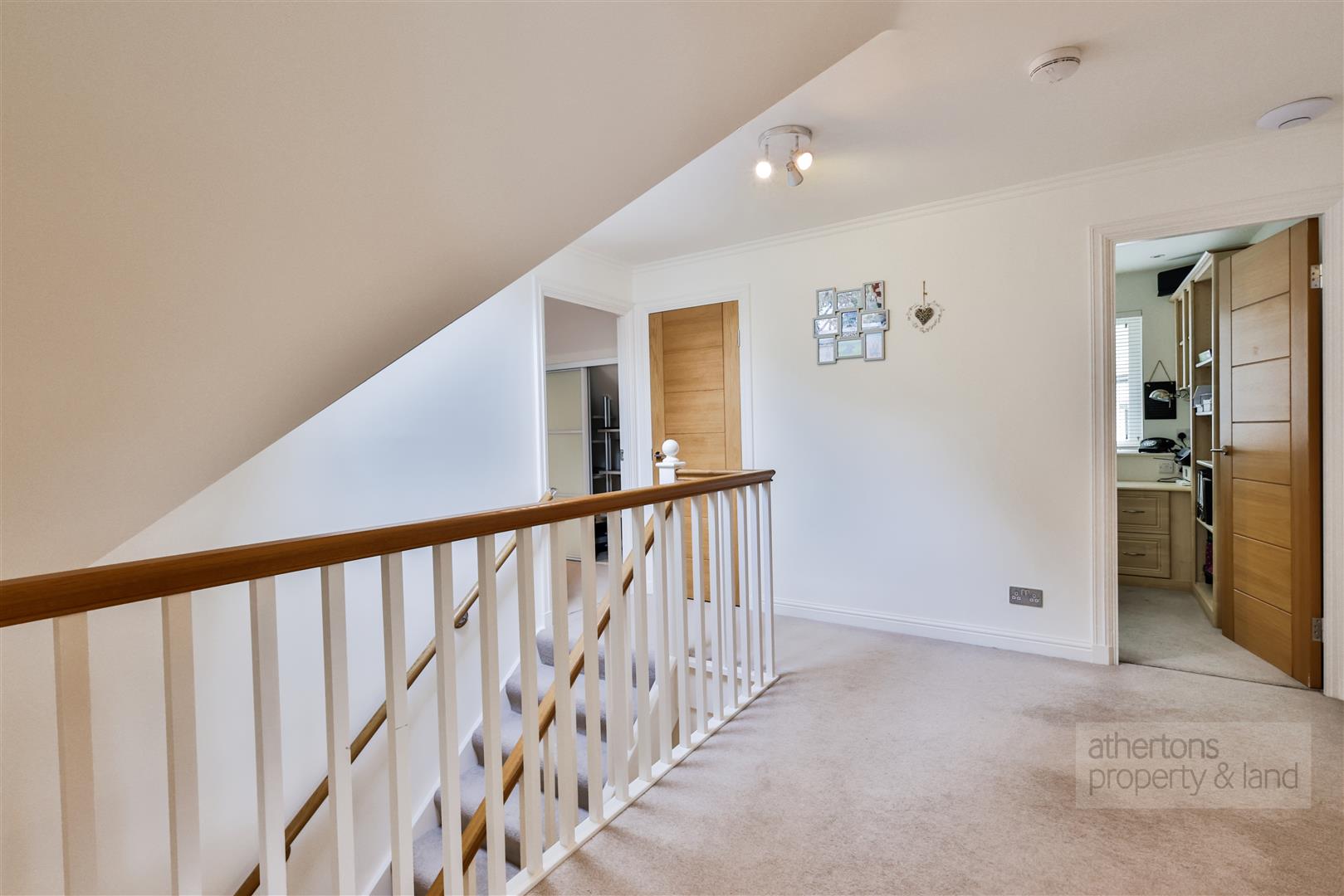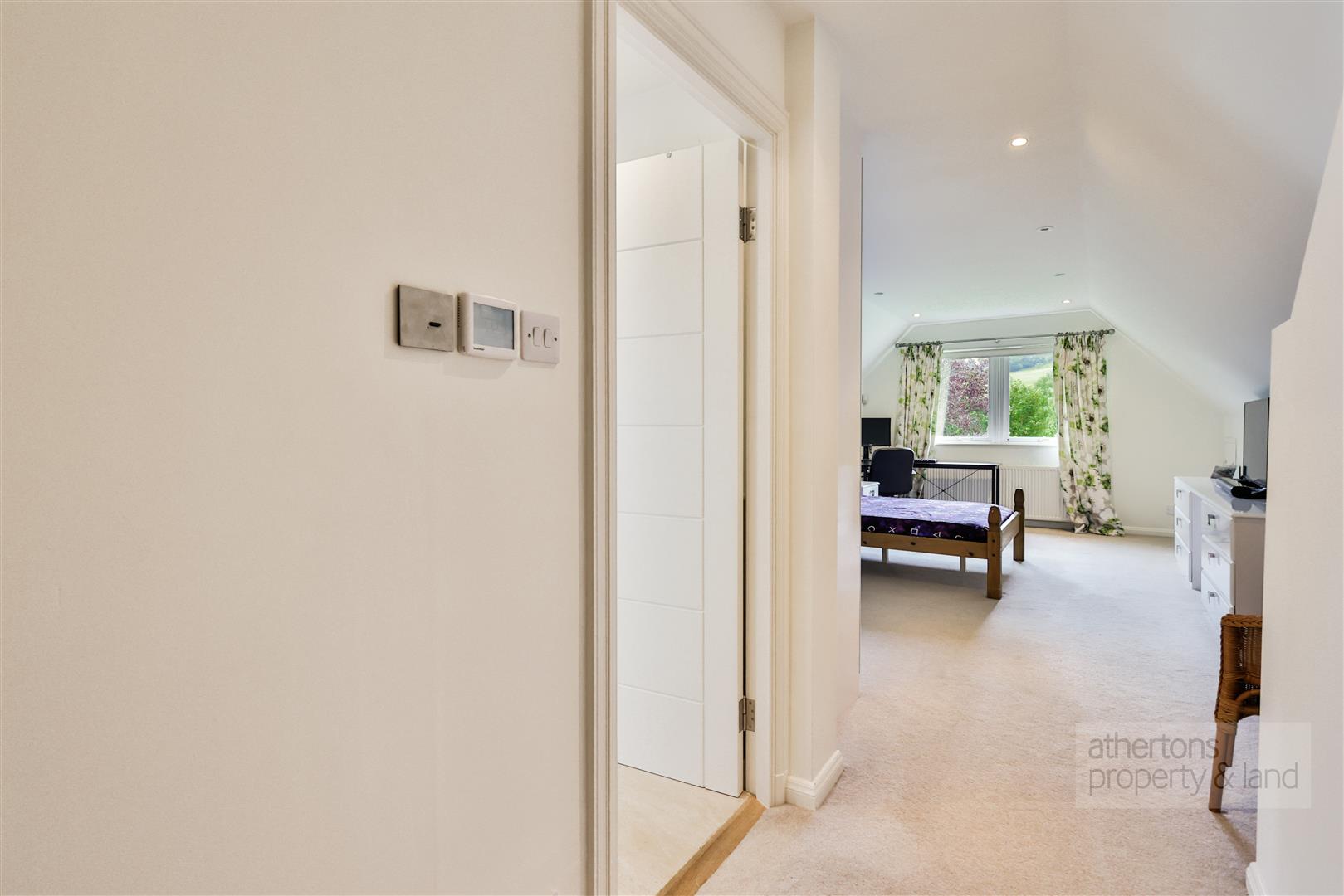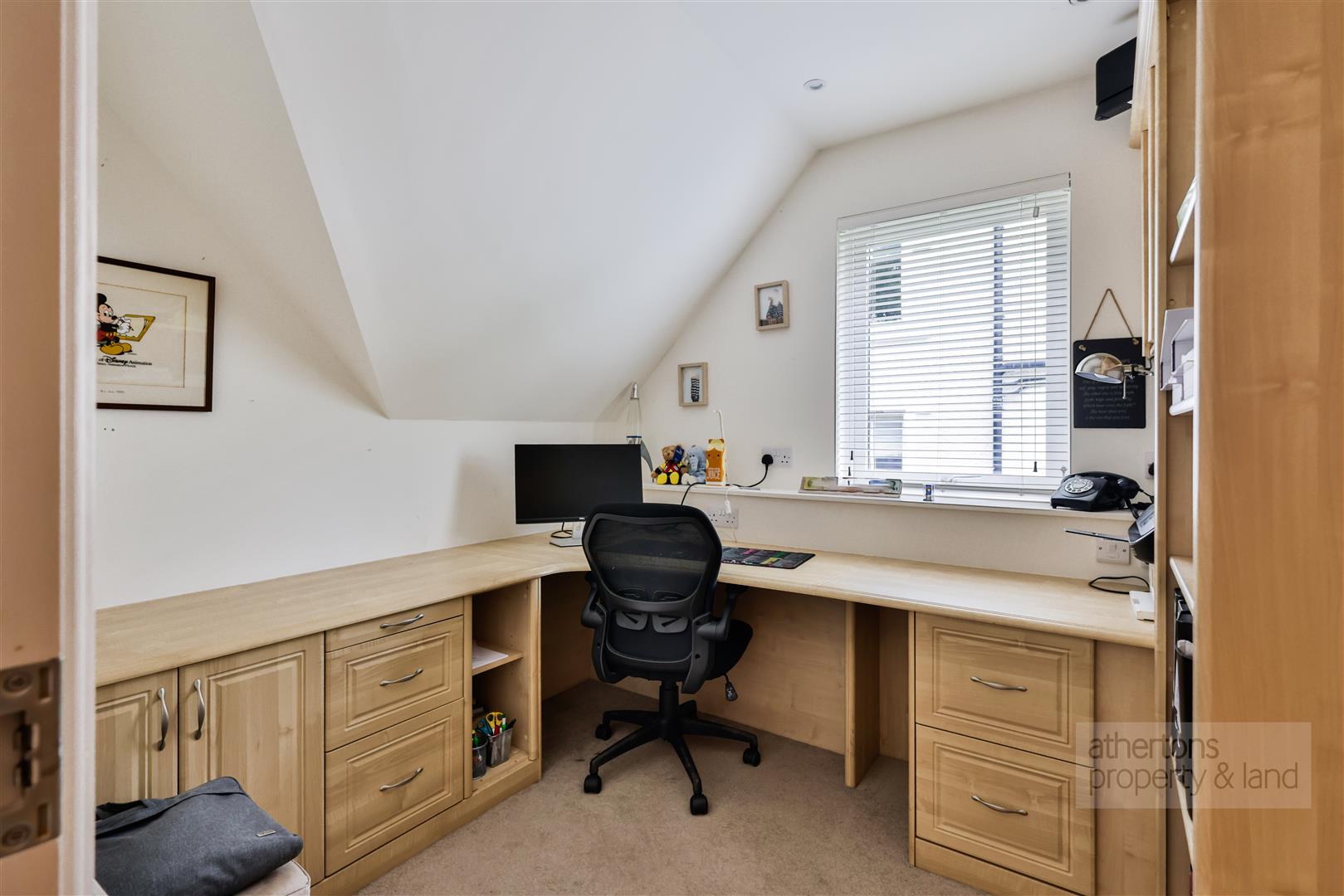To the first floor, a spacious hipped-roof landing with Velux window leads to three further double bedrooms, all fitted with wardrobes and home office/bedroom five. The principal suite enjoys both a walk-in wardrobe and a luxurious five-piece en-suite bathroom, appointed with Villeroy & Boch sanitaryware, his-and-hers basins, freestanding bath with shower attachment, rainfall shower enclosure, WC, and underfloor heating. Bedroom two also boasts a beautifully finished en-suite bathroom with bath, separate rainfall shower, and travertine basin, which could easily serve as the house bathroom if required. Bedroom three is another generous double with fitted storage, while a dedicated office with bespoke fitted furniture completes the first floor – a versatile space that could equally serve as a fifth bedroom.