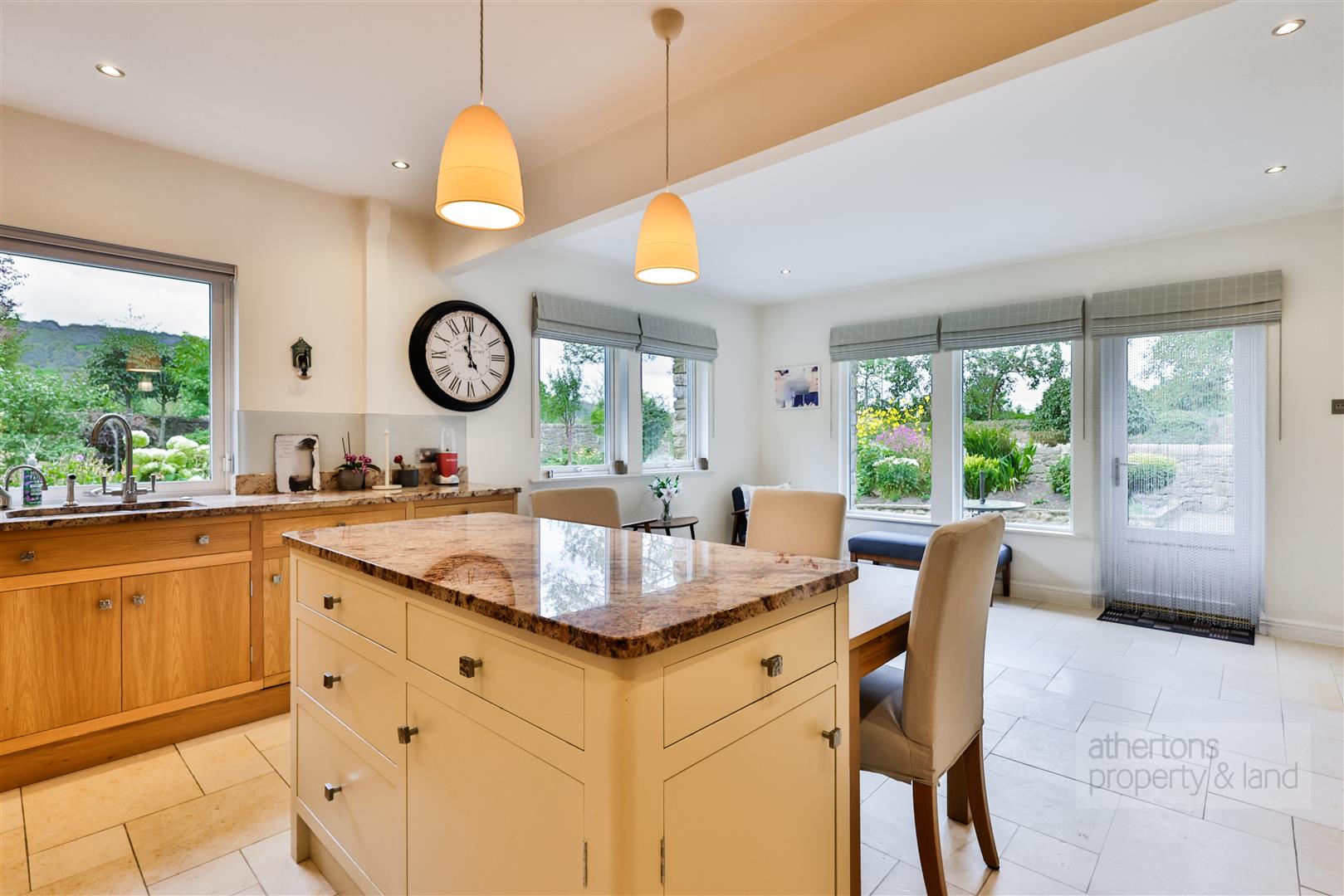 The bespoke kitchen, crafted by Secret Drawer of Skipton, is a showcase of artisanal quality and practical design. Handmade cabinetry is complemented by granite work surfaces, glass splashbacks, and a stone tiled floor with underfloor heating. A Britannia range with induction hob, integrated Liebherr fridge and freezer, Miele ovens (including microwave combination), dishwasher, Quooker hot tap, Franke water filter, and waste disposal all feature, alongside a central island unit with granite top – creating a kitchen perfectly suited for both everyday living and entertaining. A well-appointed utility room off the dining provides additional storage, appliance space, and internal access to the garage.