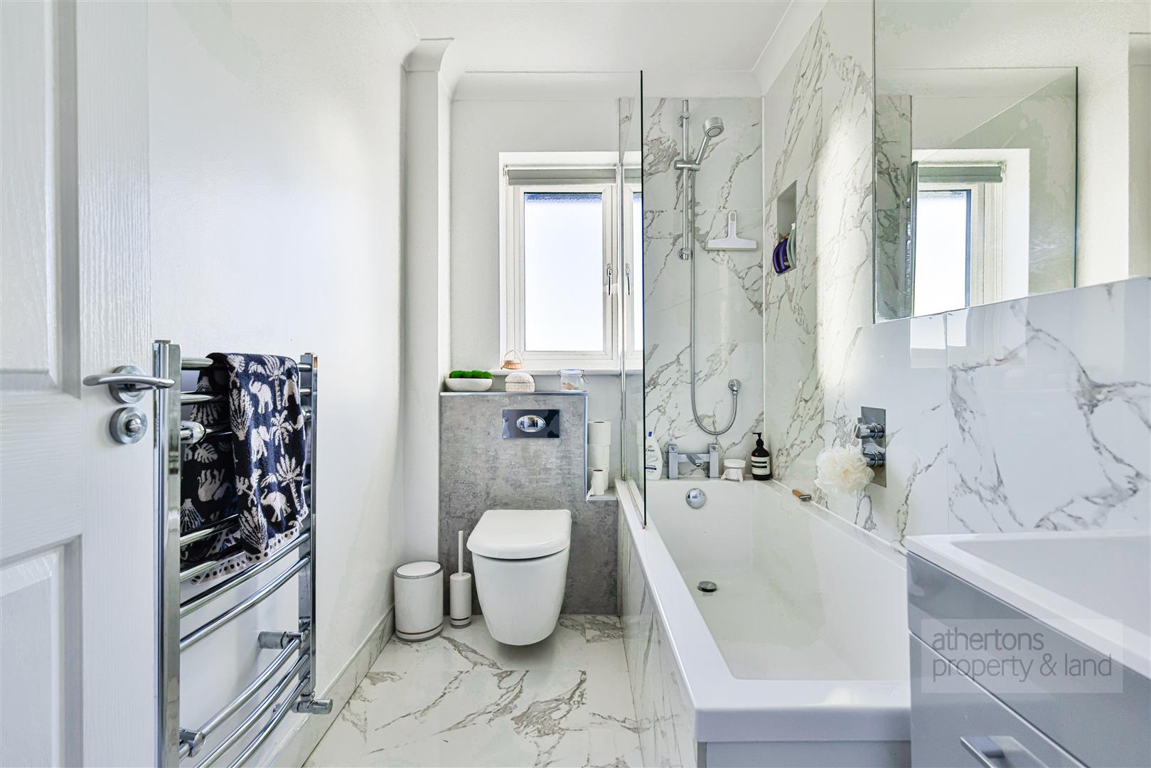 The stylish bathroom features large marble-effect tiling, a panelled bath with overhead shower and glazed screen, vanity washbasin, concealed-cistern WC, chrome ladder radiator and fixed wall mirror.