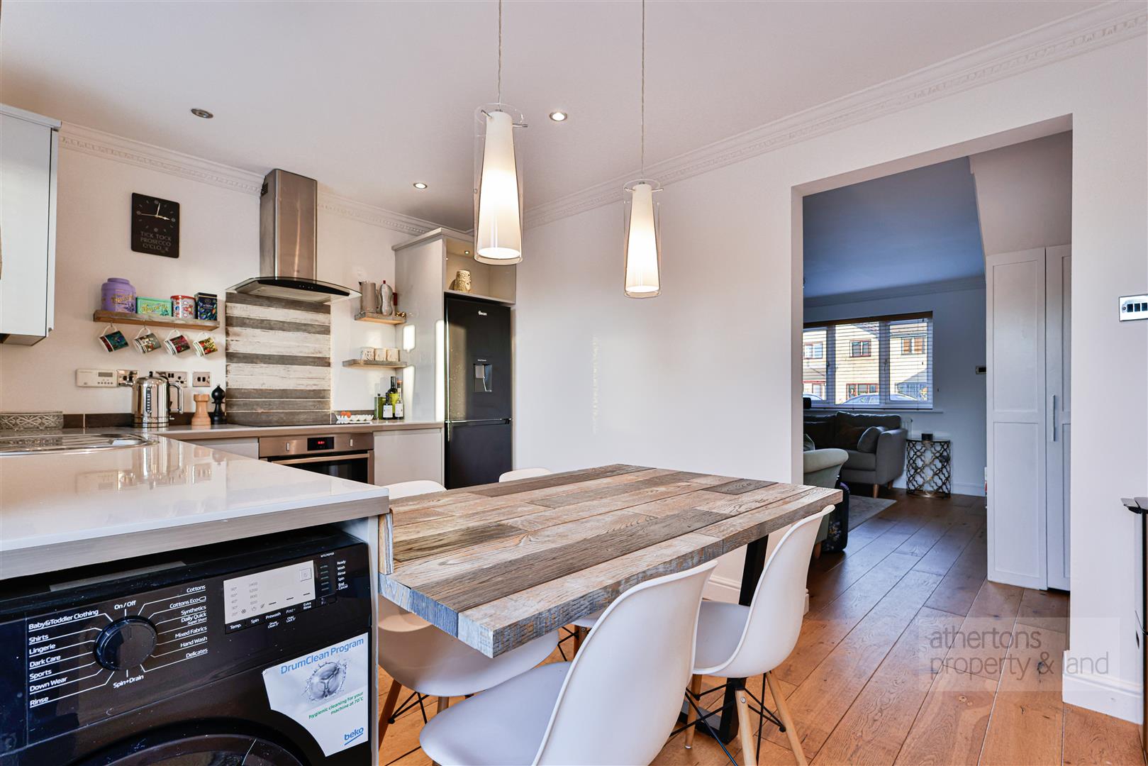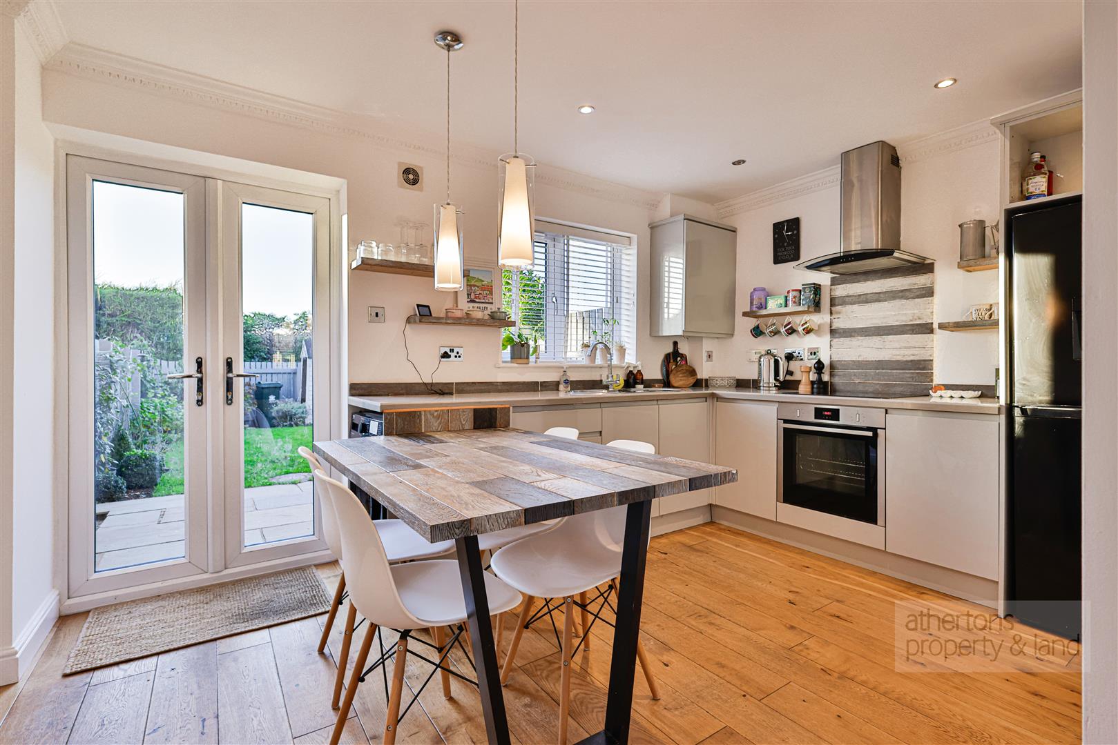 Continuing through to the rear of the property, the contemporary kitchen-diner showcases sleek gloss cabinetry with contrasting counters and splashbacks, a stainless-steel sink with mixer tap, and a fixed dining table accommodating four. A range of integrated and freestanding appliances are included, comprising a Neff electric slide-and-hide oven, induction hob with stainless steel/glass extractor, upright fridge-freezer, washing machine and slimline dishwasher. Stylish pendant lights sit above the dining area, complemented by LED downlighting. French doors open directly onto the rear garden, creating a perfect space for entertaining or relaxed dining.