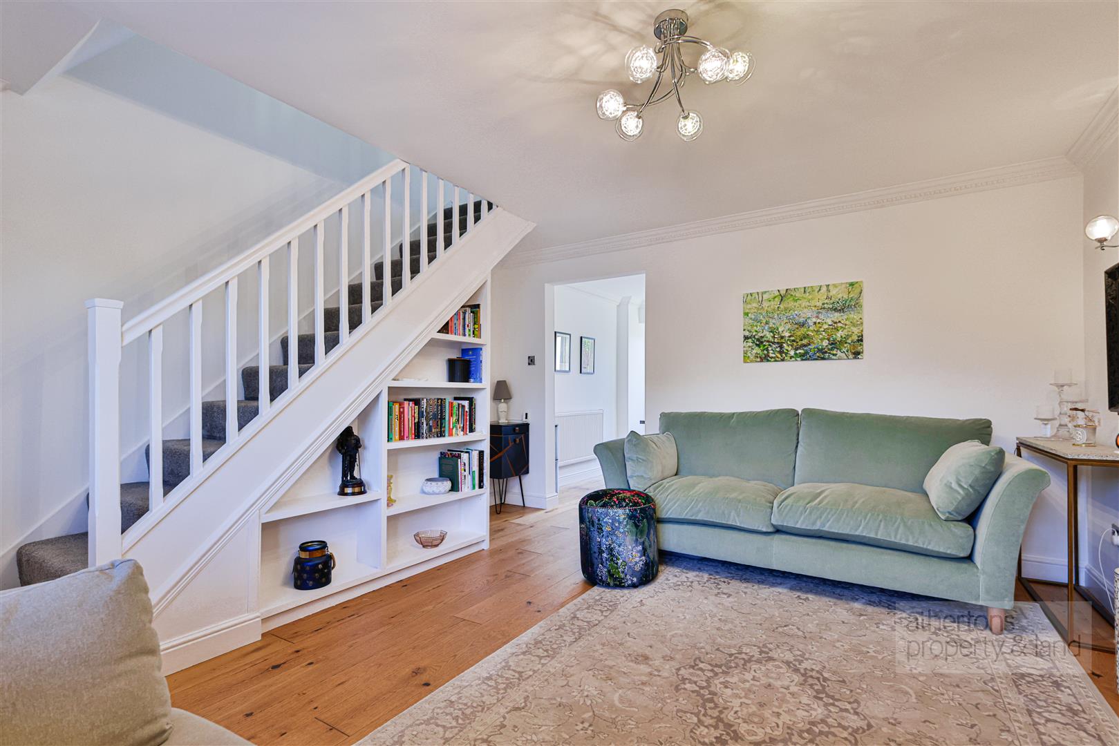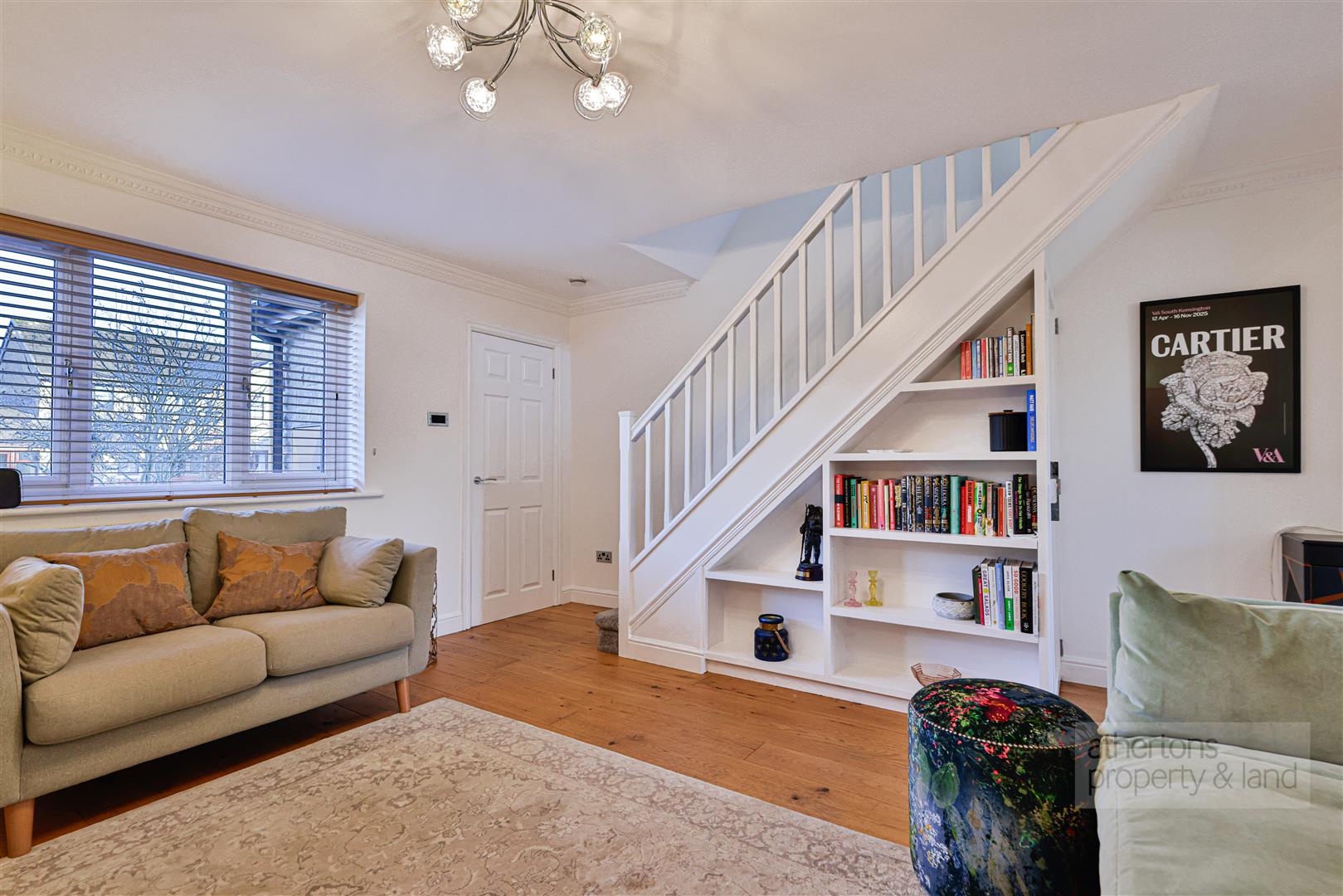 Upon entering, a uPVC Rock front door with oak-effect interior finish opens into a welcoming porch, ideal for coats and shoes. The oak-boarded flooring flows seamlessly through to the lounge and kitchen-diner, enhancing the sense of space. The lounge is an elegant, comfortable room featuring a media wall with recessed TV provision and a modern log-effect electric fire. A railed staircase ascends to the first floor and incorporates thoughtfully designed display shelving and a useful storage cupboard beneath.