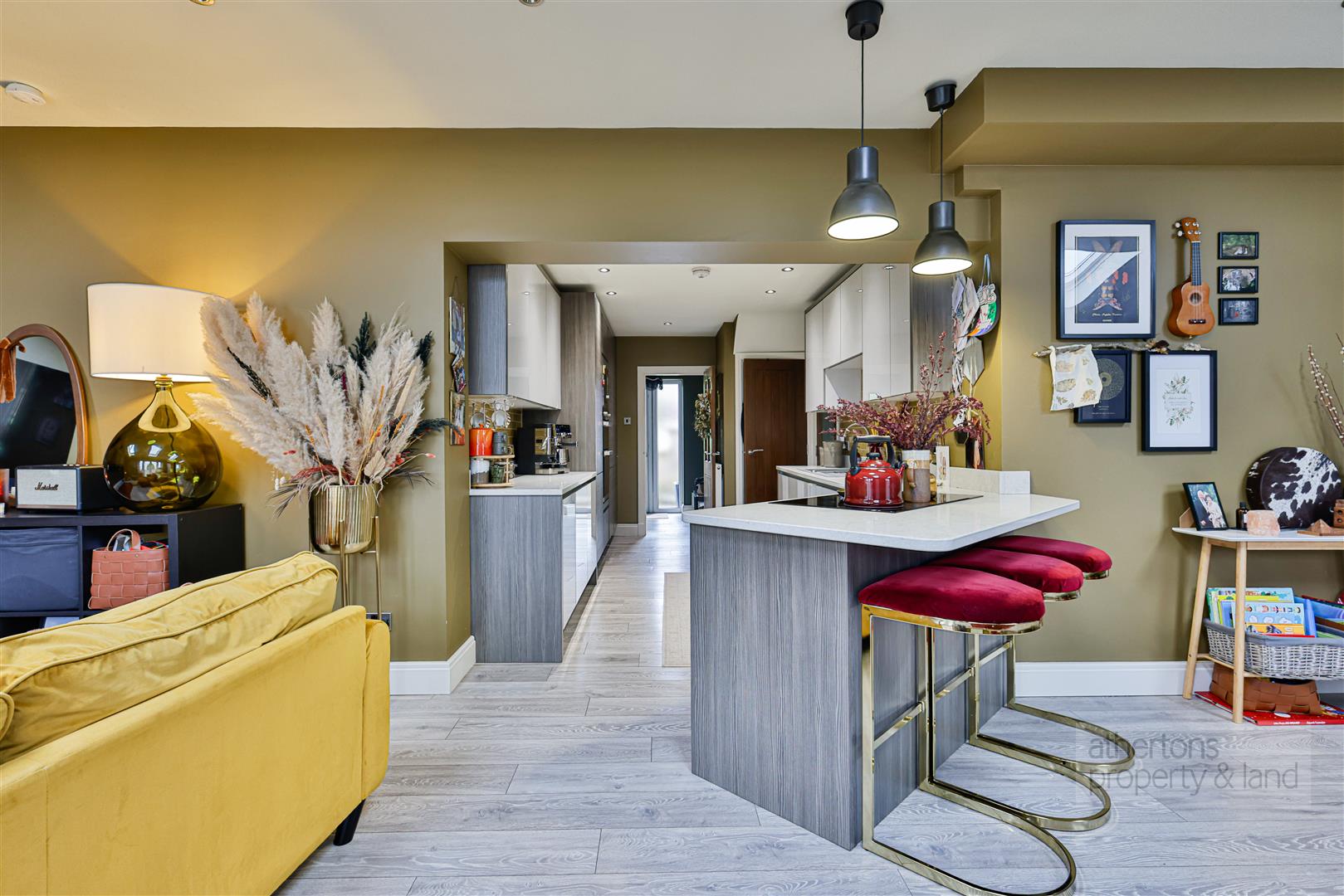 To the rear of the property, an impressive open plan living kitchen and dining area has been finished to a high standard, showcasing sleek high-gloss units with a full range of integrated appliances including a double oven/grill, microwave, full length fridge, full length freezer, dishwasher, 6 ring induction hob, quartz work surfaces with breakfast bar seating.