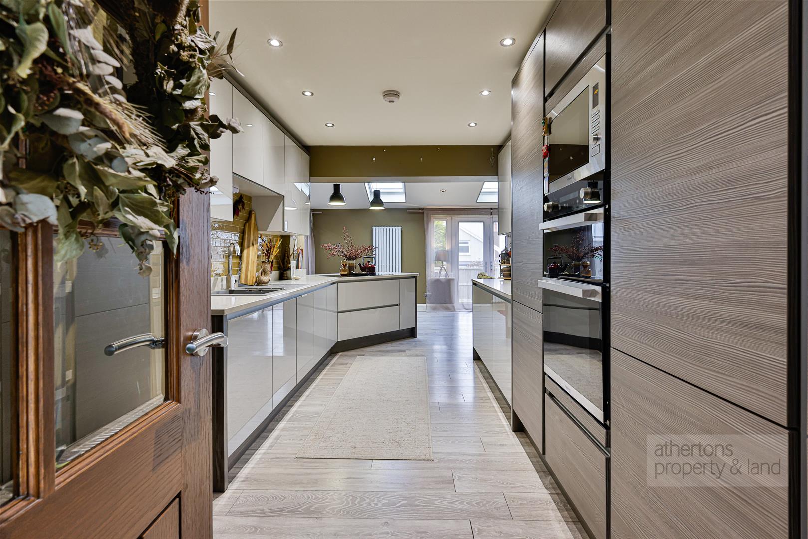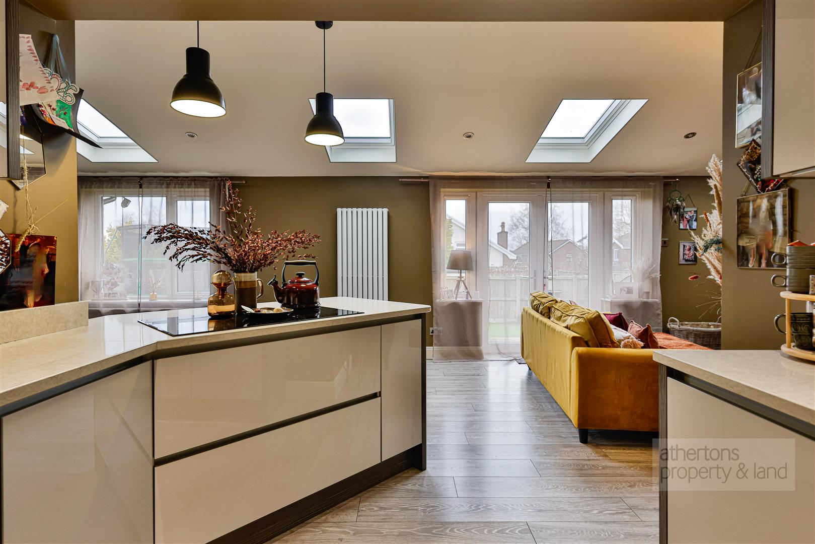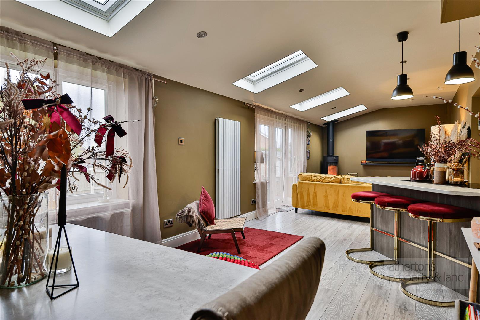 Beyond the kitchen lies a spacious additional living and dining area, flooded with natural light via Velux sky lights and double uPVC French doors opening onto the rear garden.