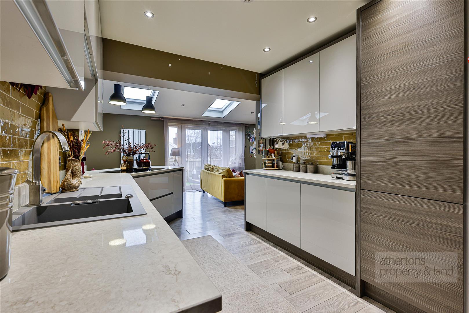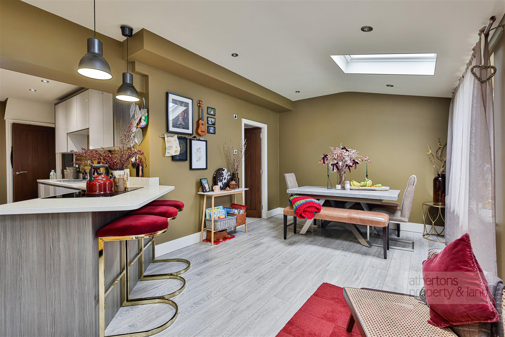Beyond the kitchen lies a spacious additional living and dining area, flooded with natural light via Velux sky lights and double uPVC French doors opening onto the rear garden.