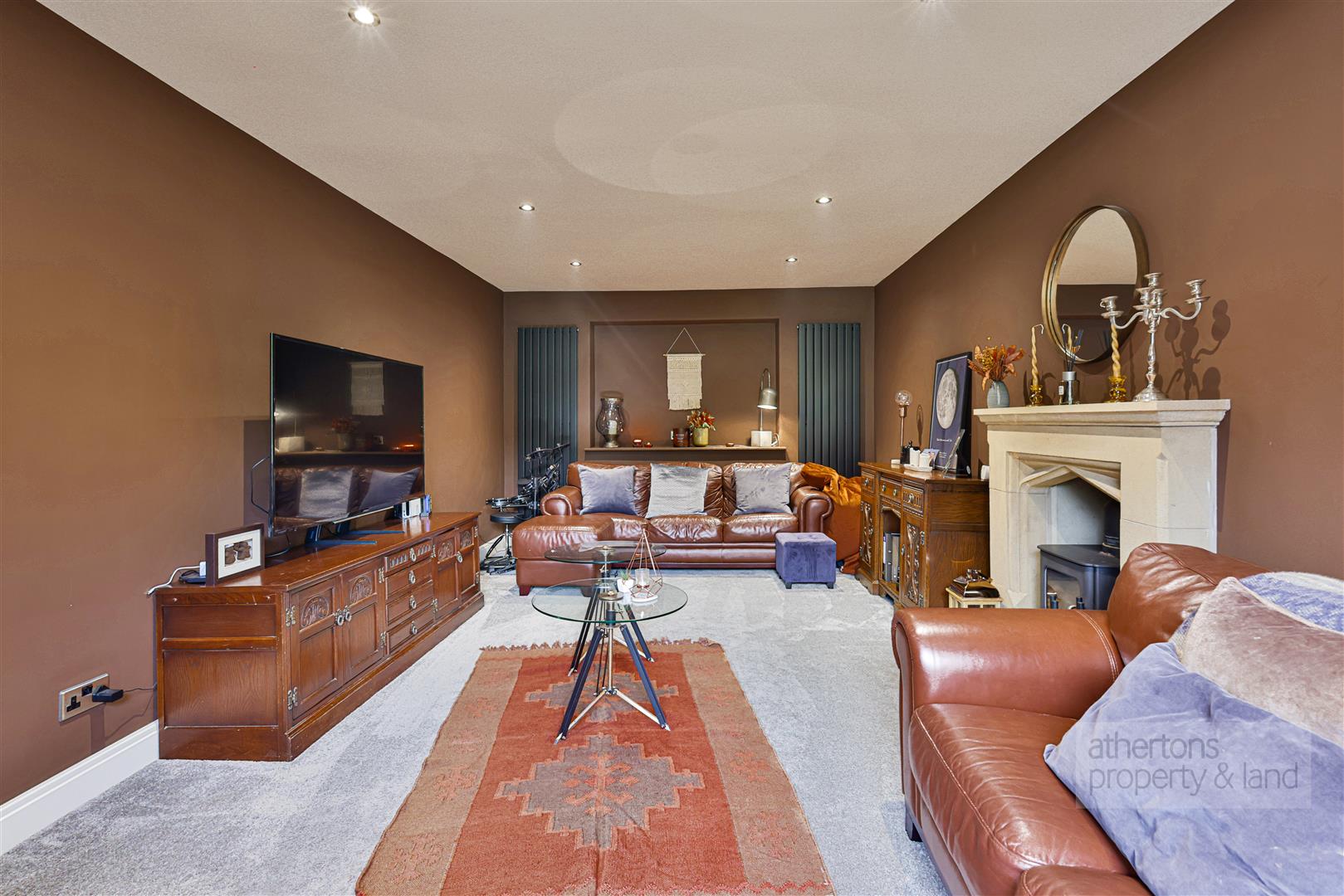Internally, the ground floor opens with a welcoming entrance hall leading into an attractive living room, finished in warm, neutral tones and featuring fitted carpets, recessed spotlights, a feature limestone fireplace with log burner, and contemporary vertical radiators.
